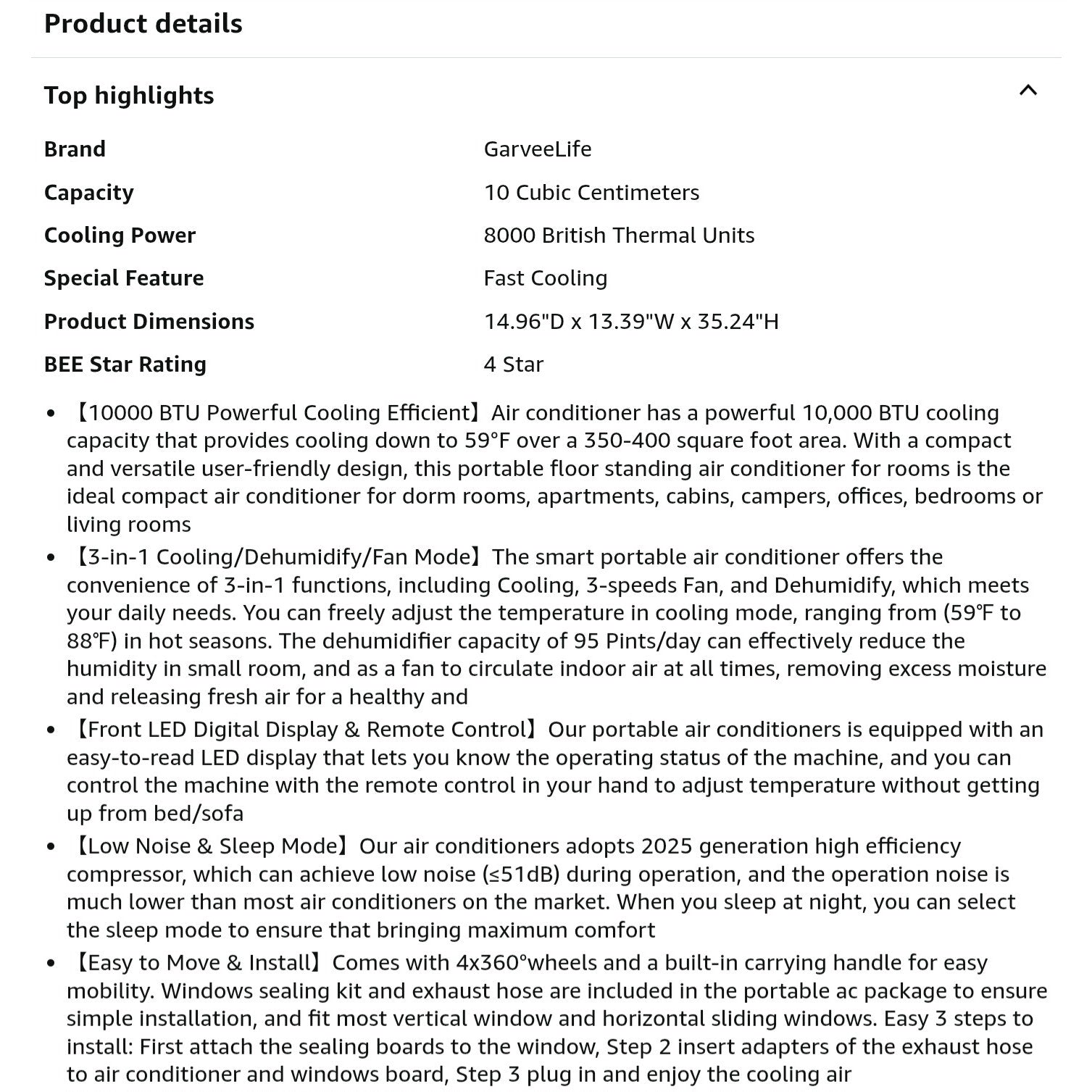 $ 165 obo 10000 BTU Portable Air Conditioners with Remote Control, 3-in-1 Free Standing Cooling AC Unit with Dehumidifier Fan Function, Cools Room up 450 Sq. Ft, Auto Swing, Sleep Mode, 24H Timer