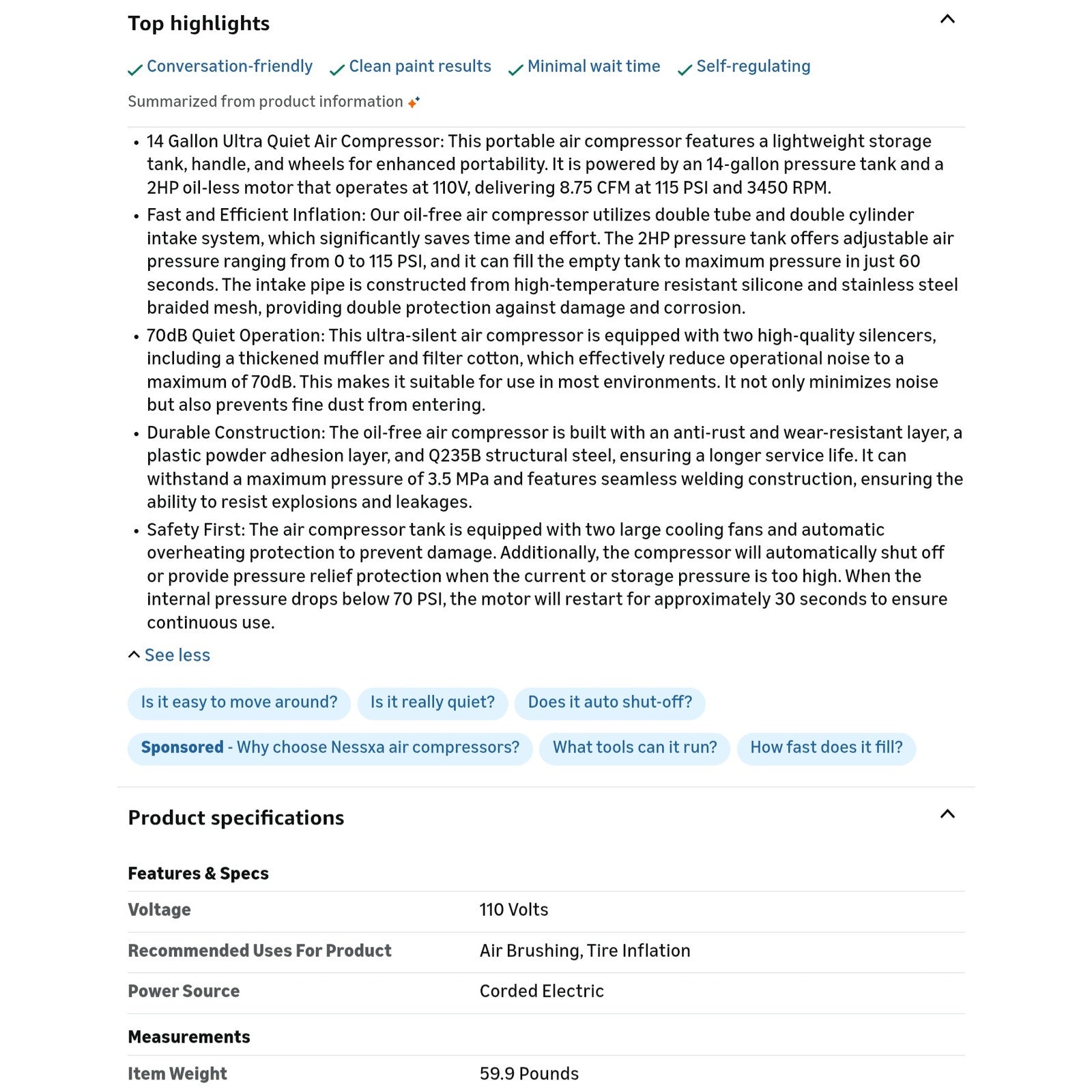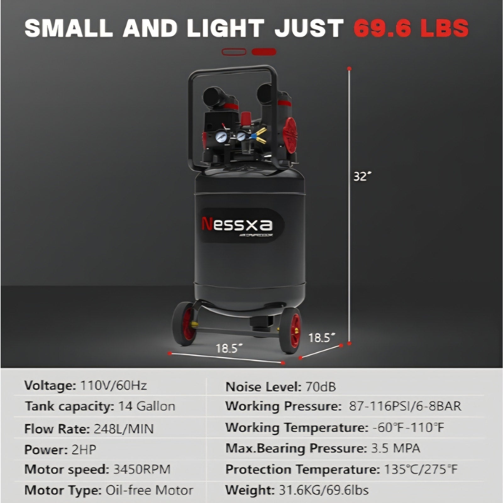$ 190 OBO 14 Gallon Ultra Quiet Air Compressor with 2 Quick Couplers 2HP 8.75 CFM, Max 115 PSI Pressure Oil-Free Air Compressor Tank, 70dB Quiet Compressor for Auto Repair, Tire Inflation 110V/60hz