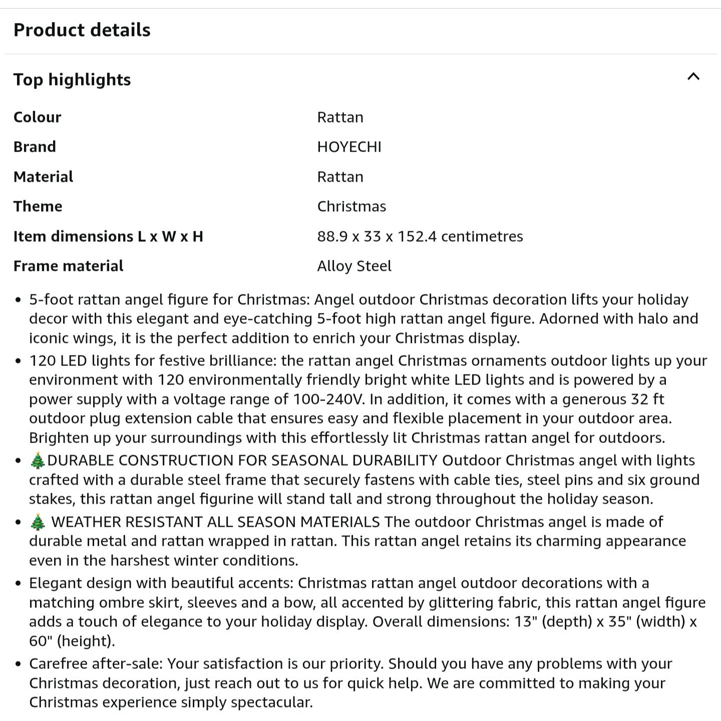 $ 75 obo 5' Rattan Angel Christmas Decoration for Outdoor - Lighted Angel Christmas Decoration with 120 LED Lights for Outdoors, Elegant Winged Christmas Ornament for Lawn