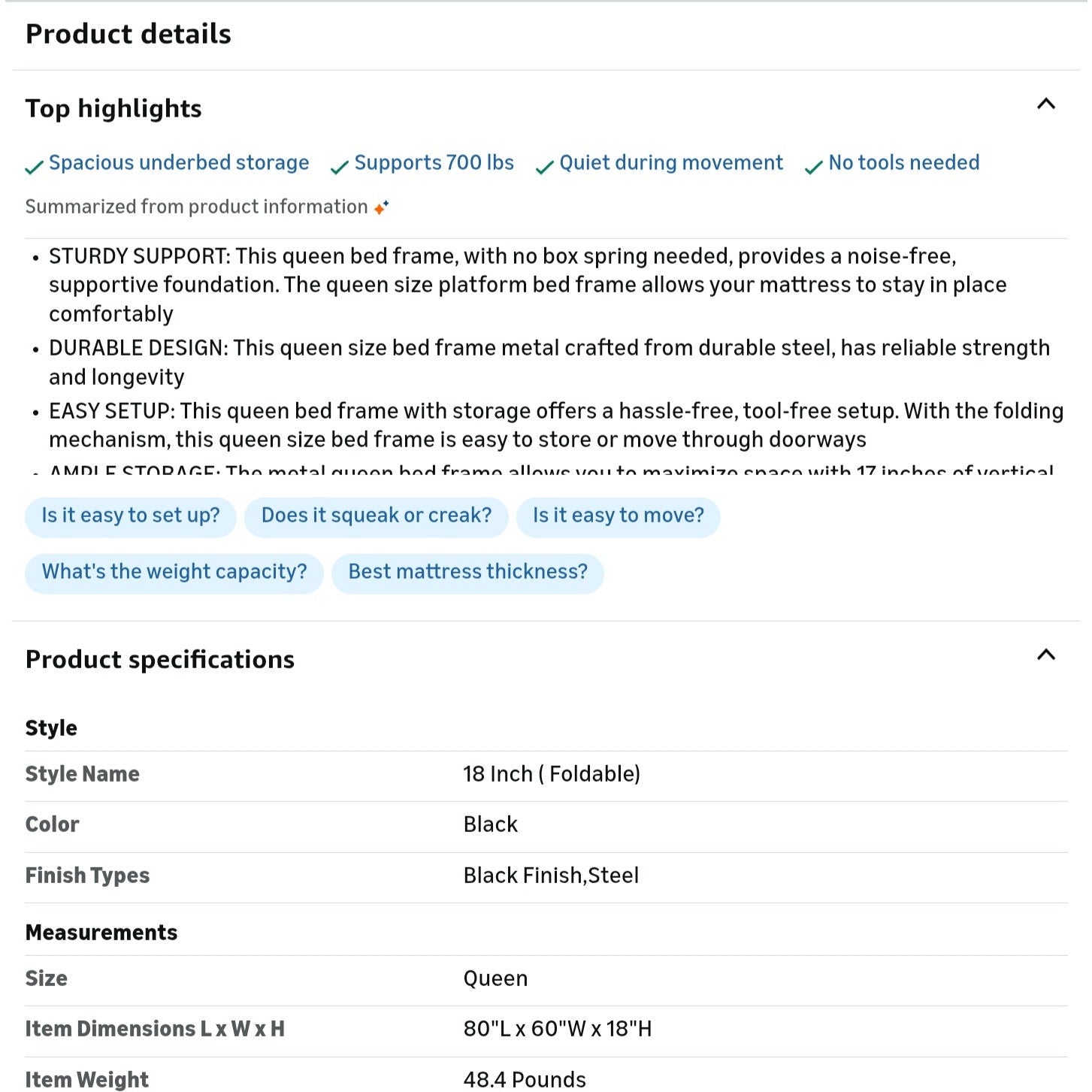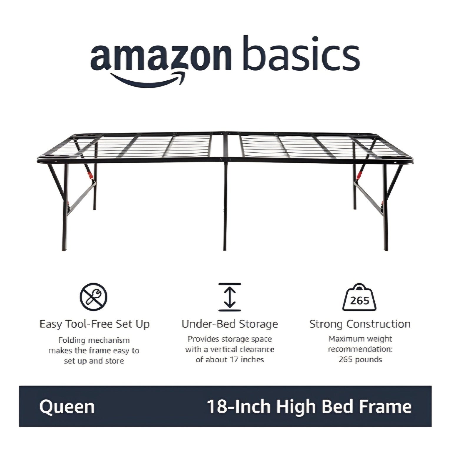 $ 95 OBO Amazon Basics Bed Frame with Storage, Foldable Metal Platform, Queen