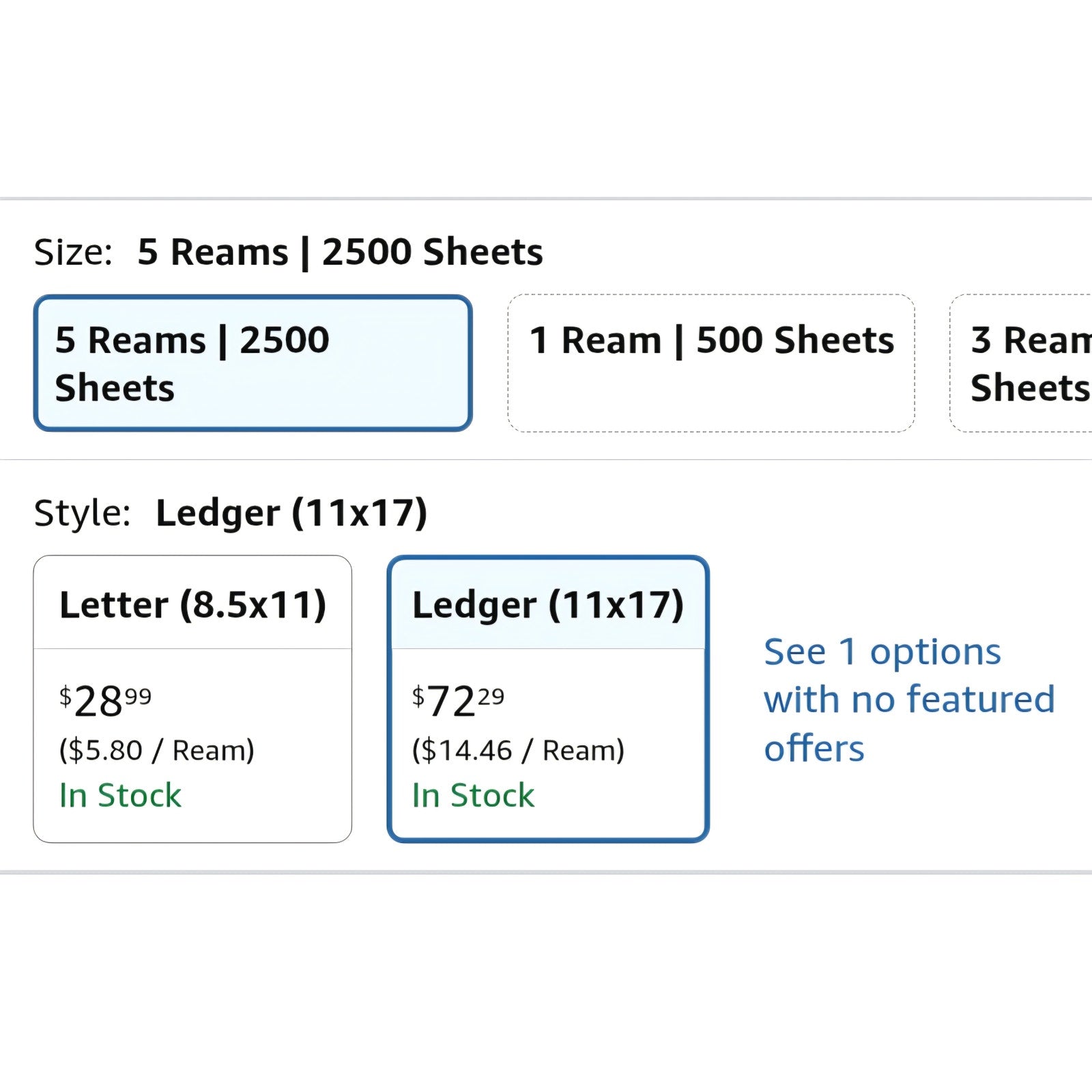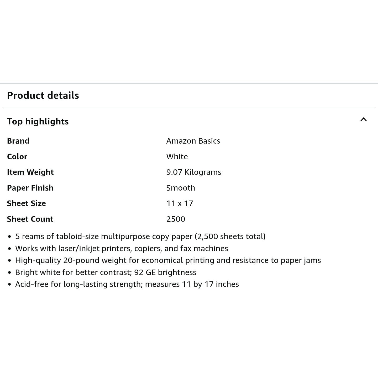 $ 50 obo Amazon Basics Multipurpose Copy Printer Paper, 20 lb, 11 x 17 Inches, 5 Reams (2,500 Sheets), 92 Bright, White