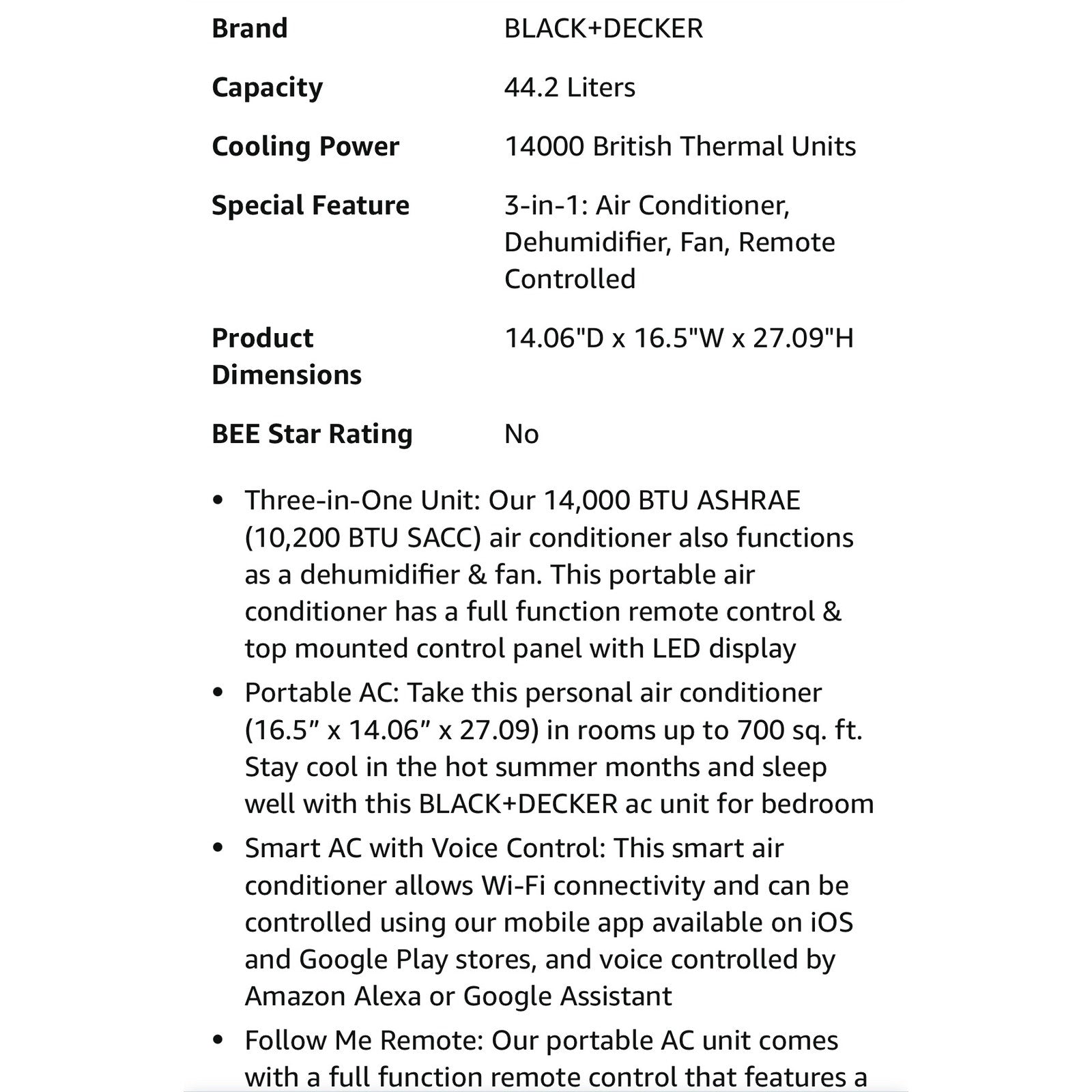 BLACK+DECKER Smart Portable Air Conditioner, 14,000 BTU (10,200 BTU SACC)