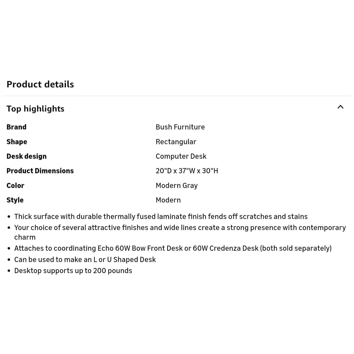 $ 95 Bush Business Furniture Echo Desk Return, 36W, Modern Gray