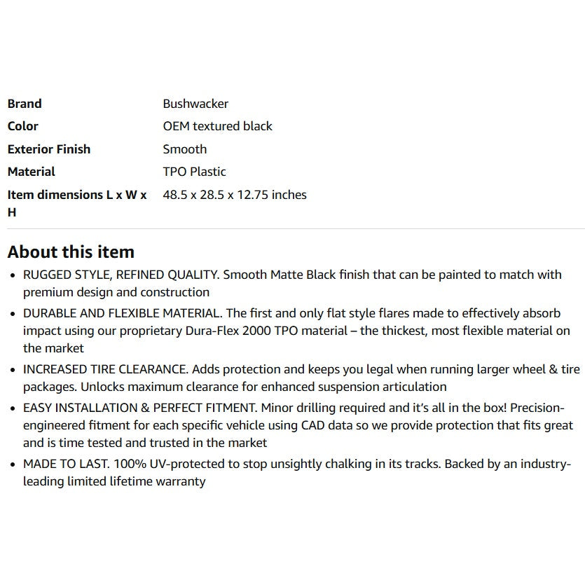 $ 350 Bushwacker Jeep Flat Style Front & Rear Fender Flares | 4-Piece Set, Black, Textured Finish | 10918-07 | Fits 2007-2018 Jeep Wrangler JK Unlimited 4-Door