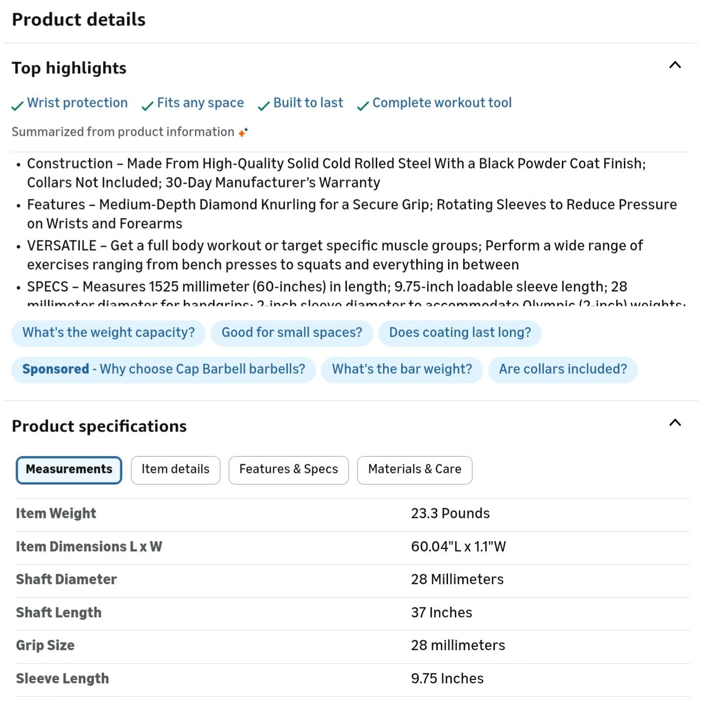$ 40 CAP Barbell 2-Inch Olympic Barbell Bars | 5 ft, 6 ft, & 7 ft