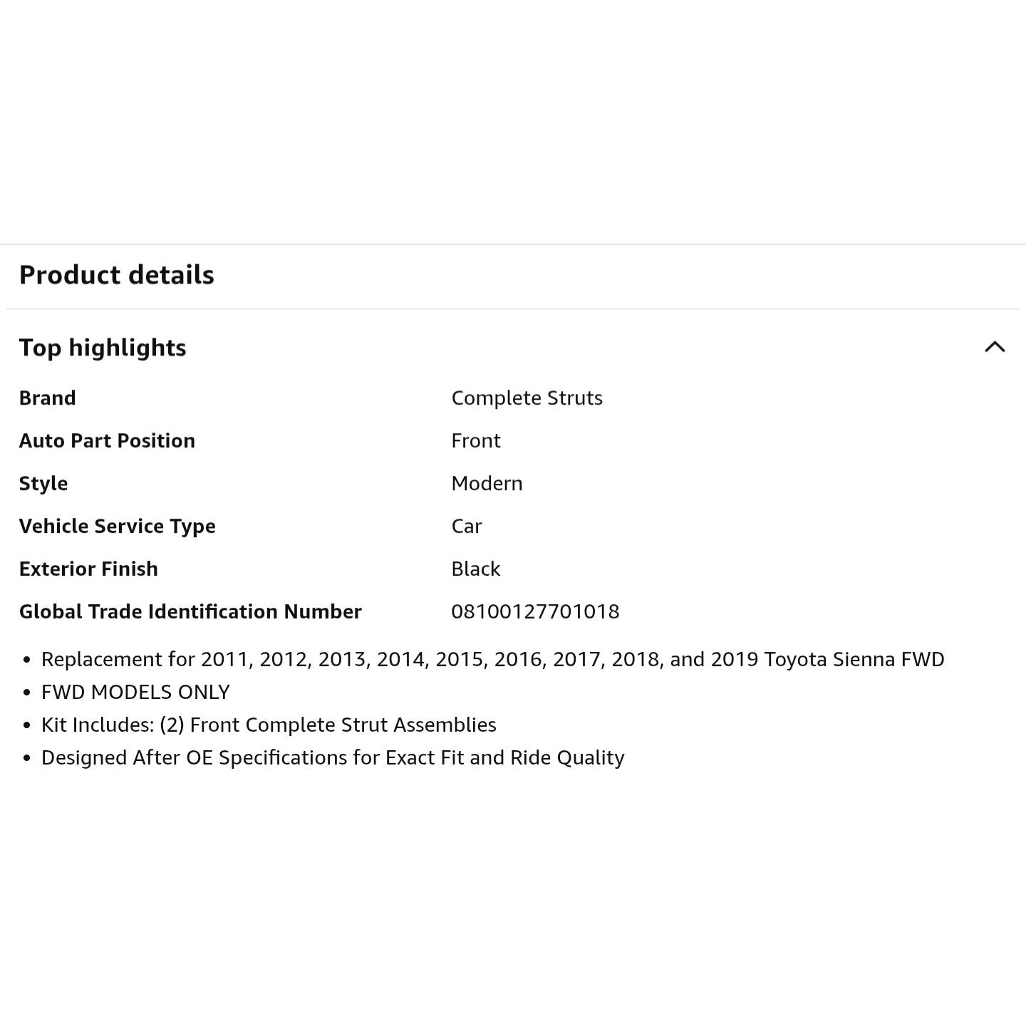 COMPLETESTRUTS Front Quick Complete Strut Assemblies with Coil Springs Replacement for 2011-2019 Toyota Sienna FWD - Set of 2