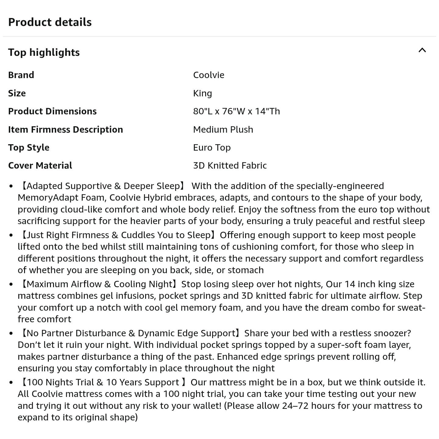 $ 450 obo Coolvie 14 Inch King Mattress, Medium Plush Gel Memory Foam Mattress Hybrid, Double Cooling King Size in a Box Euro Top with CertiPUR-US Certified Foam, Supportive Pocket Coil for Motion Isolation