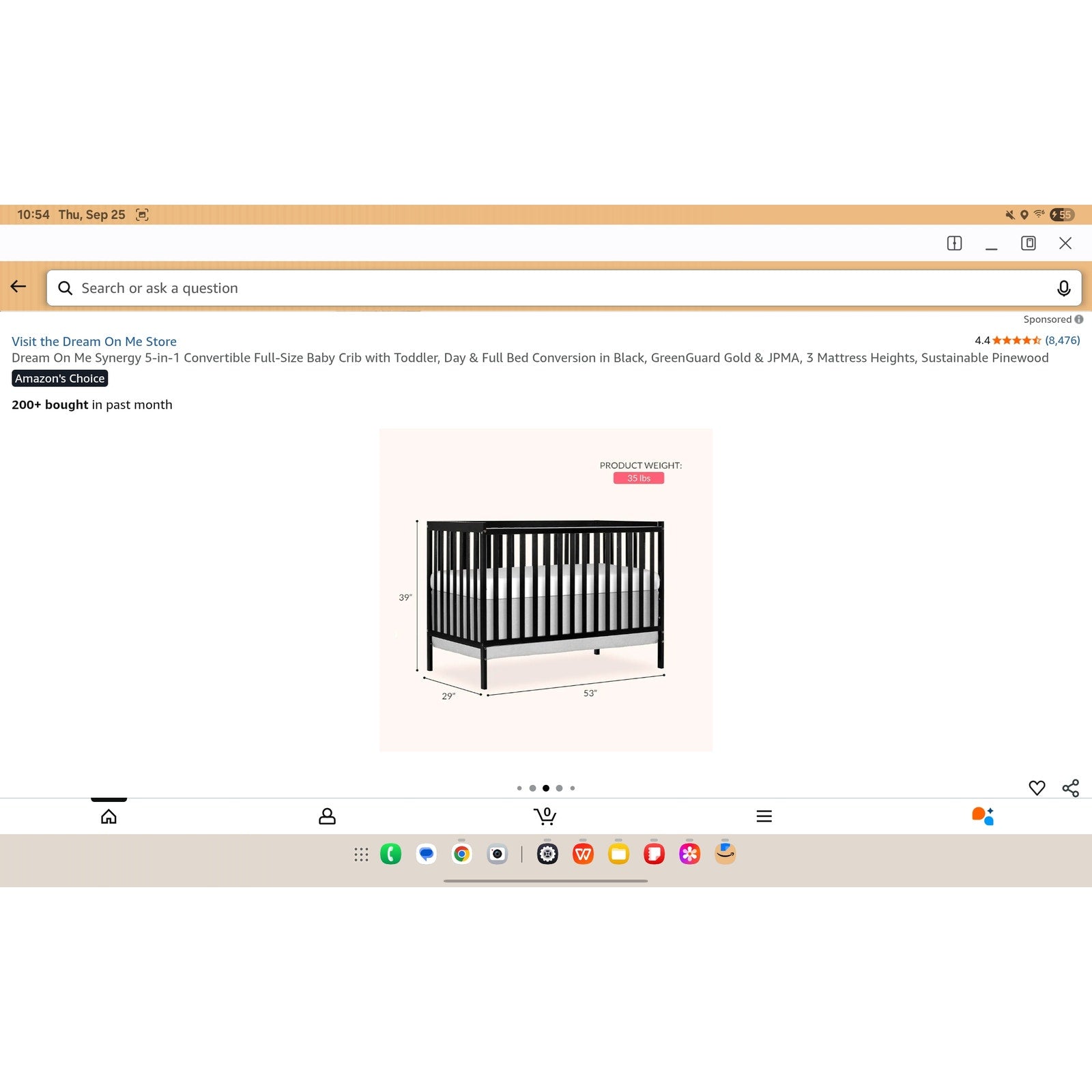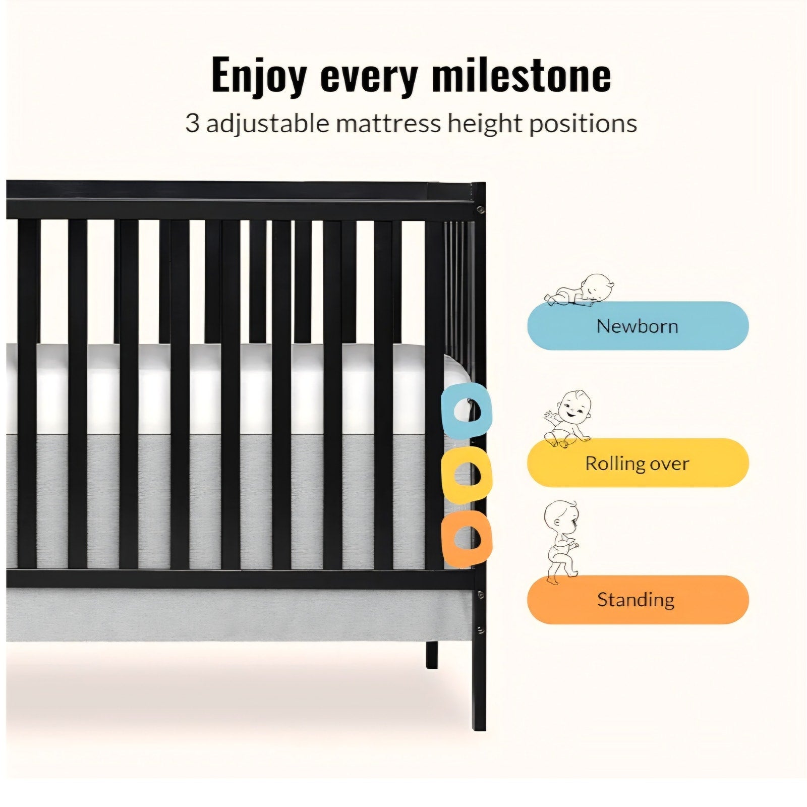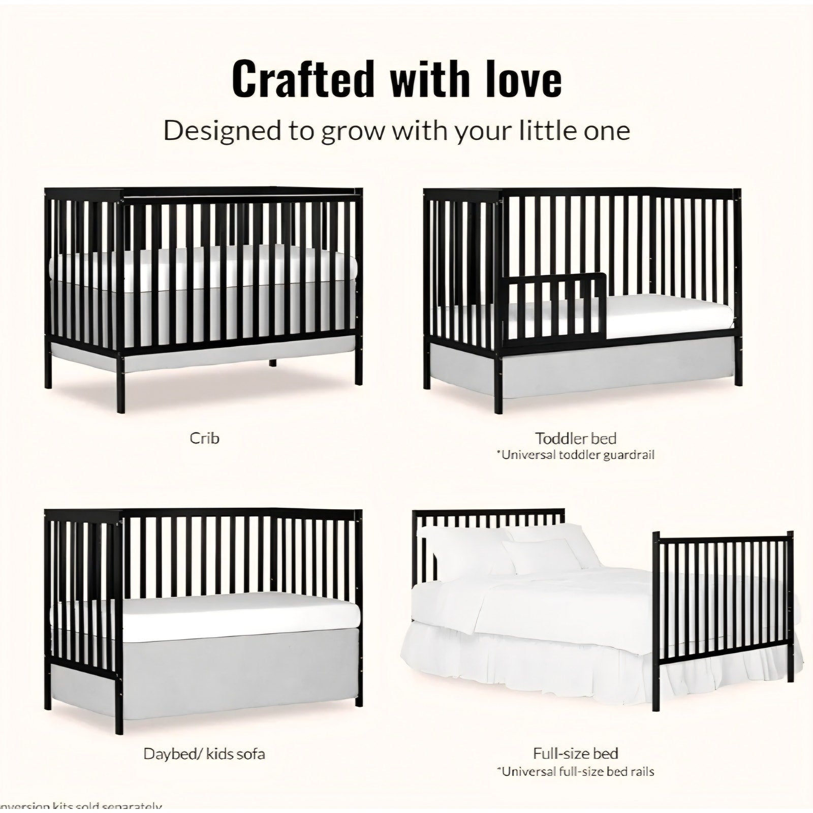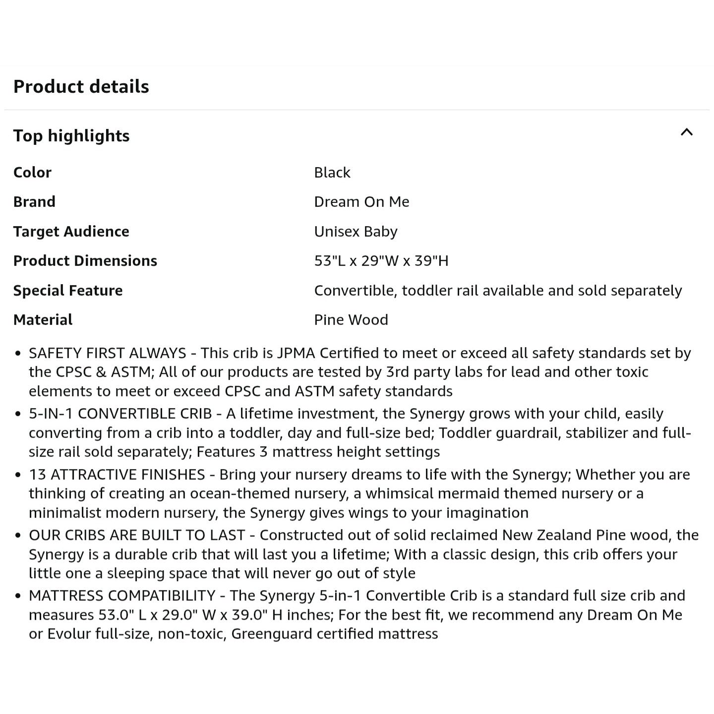 $ 90 OBO Dream On Me Synergy 5-in-1 Convertible Full-Size Baby Crib with Toddler, Day & Full Bed Conversion in Black, GreenGuard Gold & JPMA, 3 Mattress Heights, Sustainable Pinewood