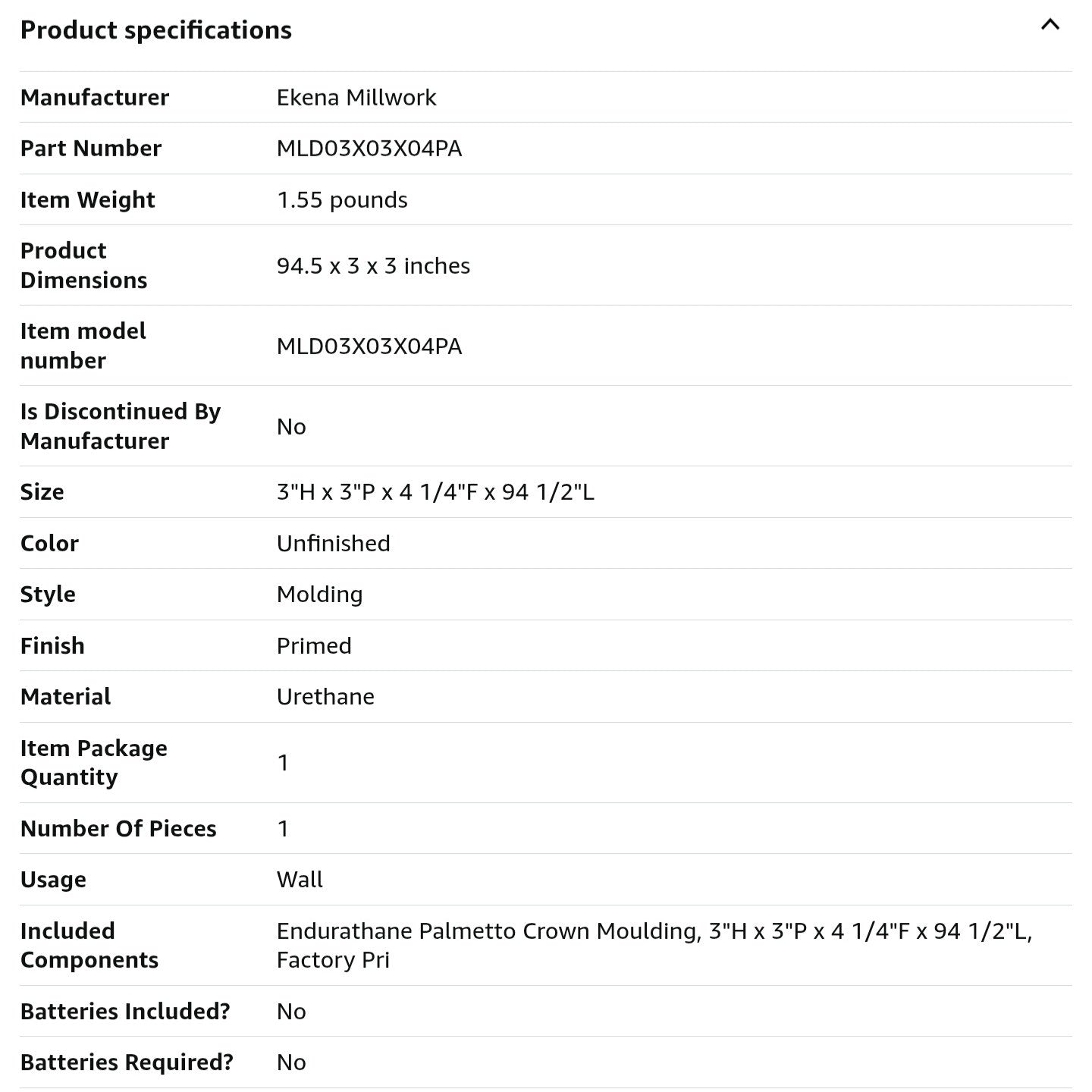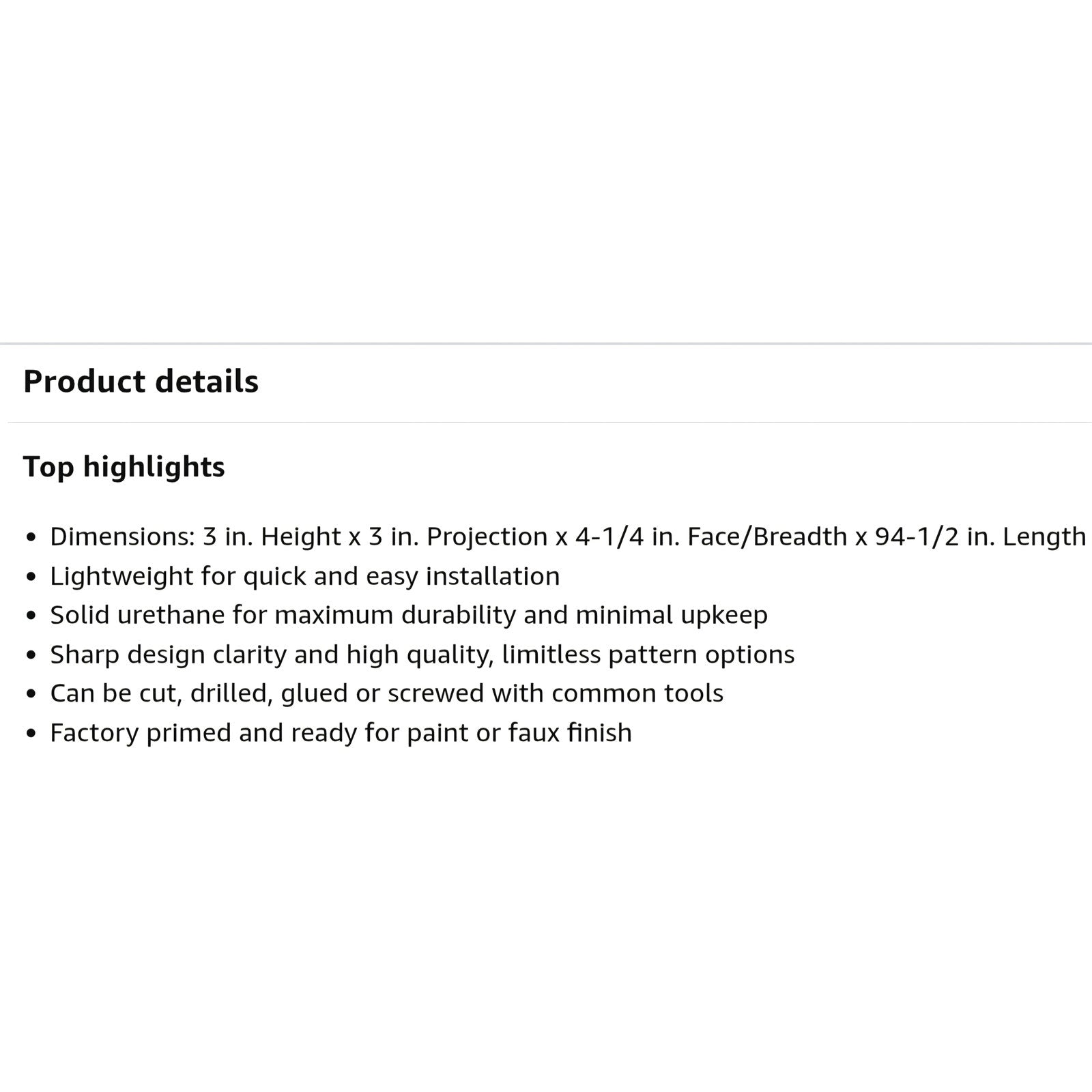 $ 20 obo Endurathane Palmetto Crown Moulding, 3"H x 3"P x 4 1/4"F x 94 1/2"L, Factory Primed