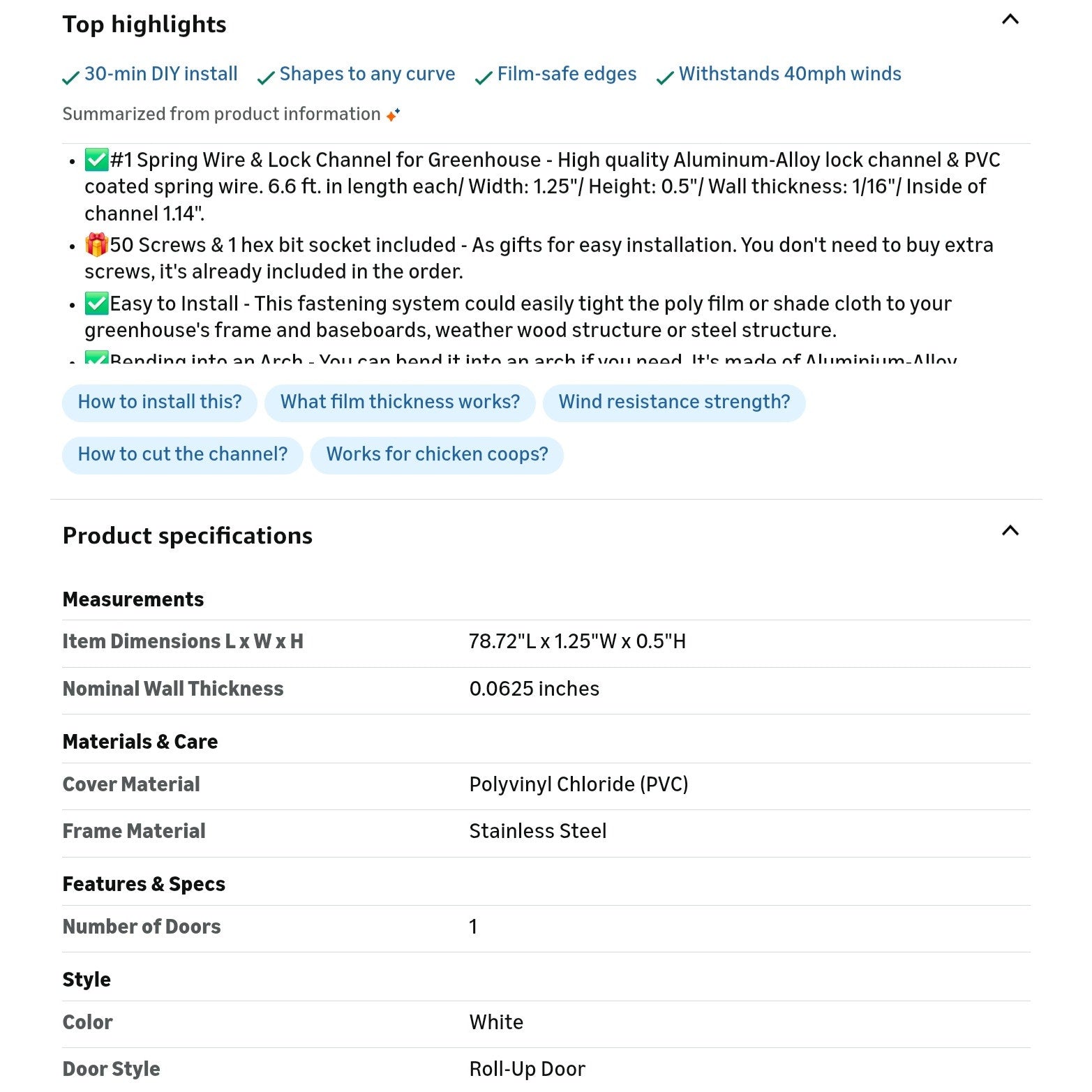 $ 55 OBO Greenhouse Spring Wire & Lock Channel 6.6 ft - PVC Coated Spring Wire & Aluminum U-Channel Bundle, Farmer Greenhouse Poly Film or Shade Cloth Attachment, 50 Mounting Screws Included [10 Pack]