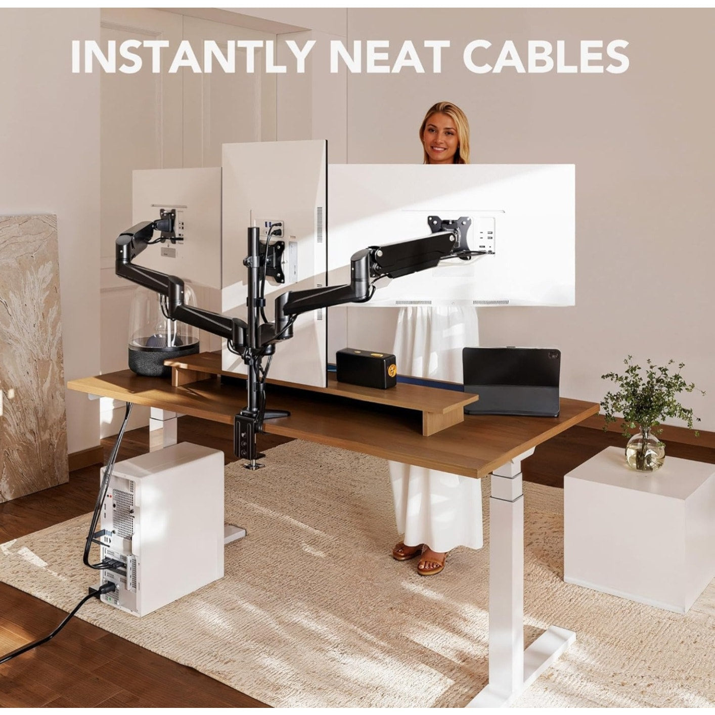 $ 65 obo HUANUO Triple Monitor Mount for 17 to 32 inch Screens, Gas Springs Adjustment Triple Monitor Stand with Swivel, Tilt, Rotation, Clamp & Grommet Kit (Black)