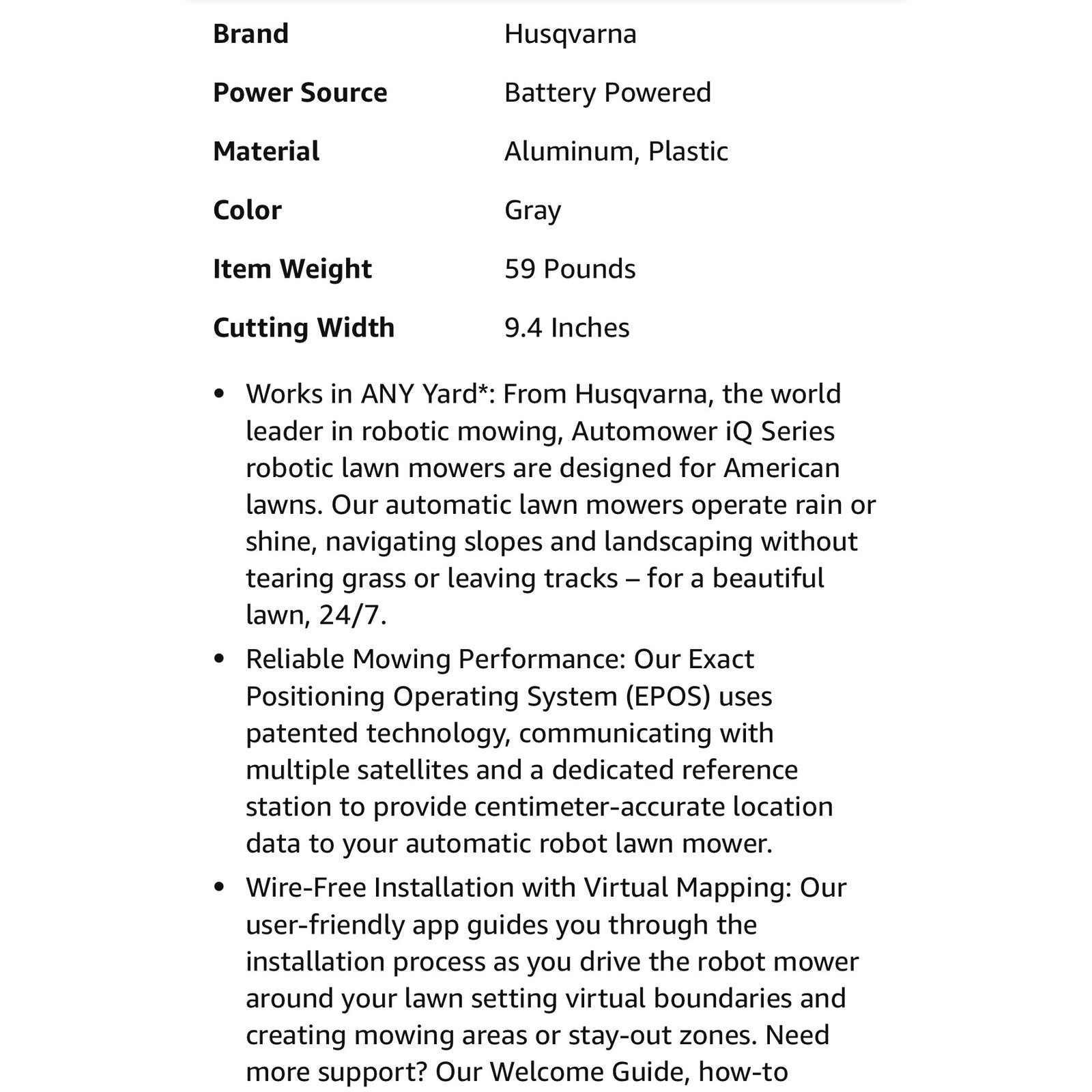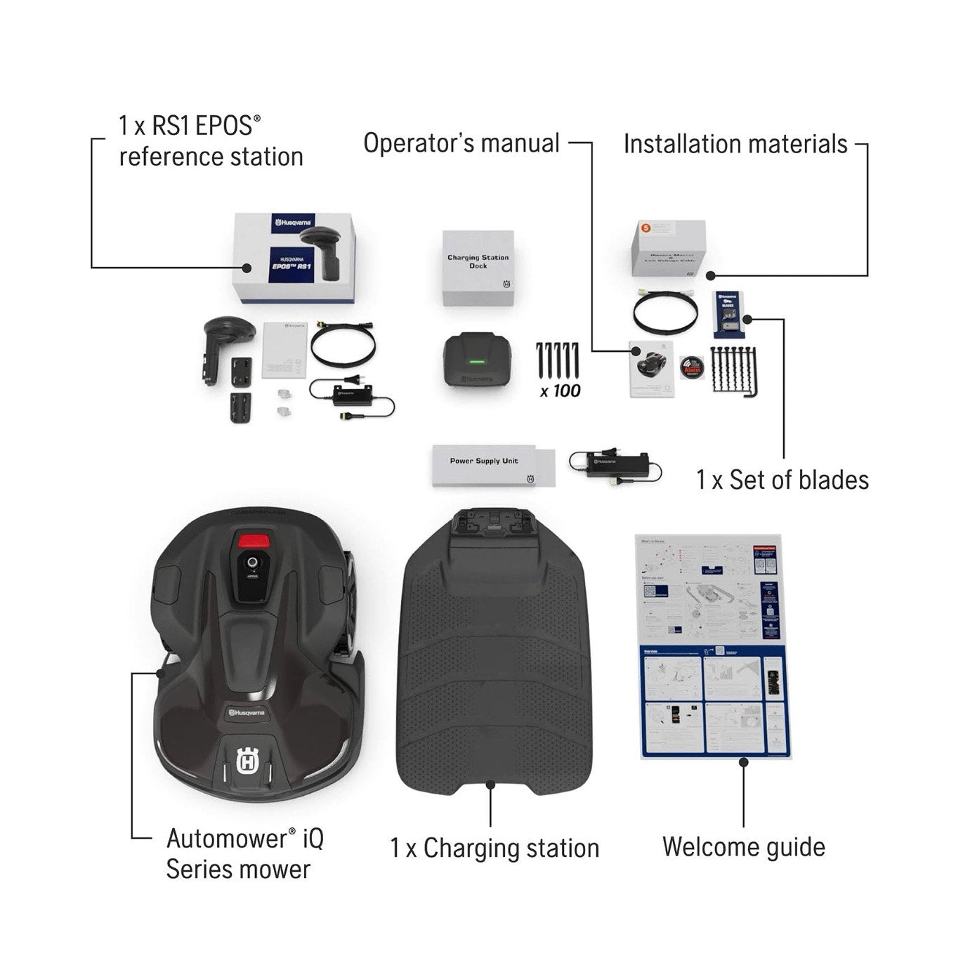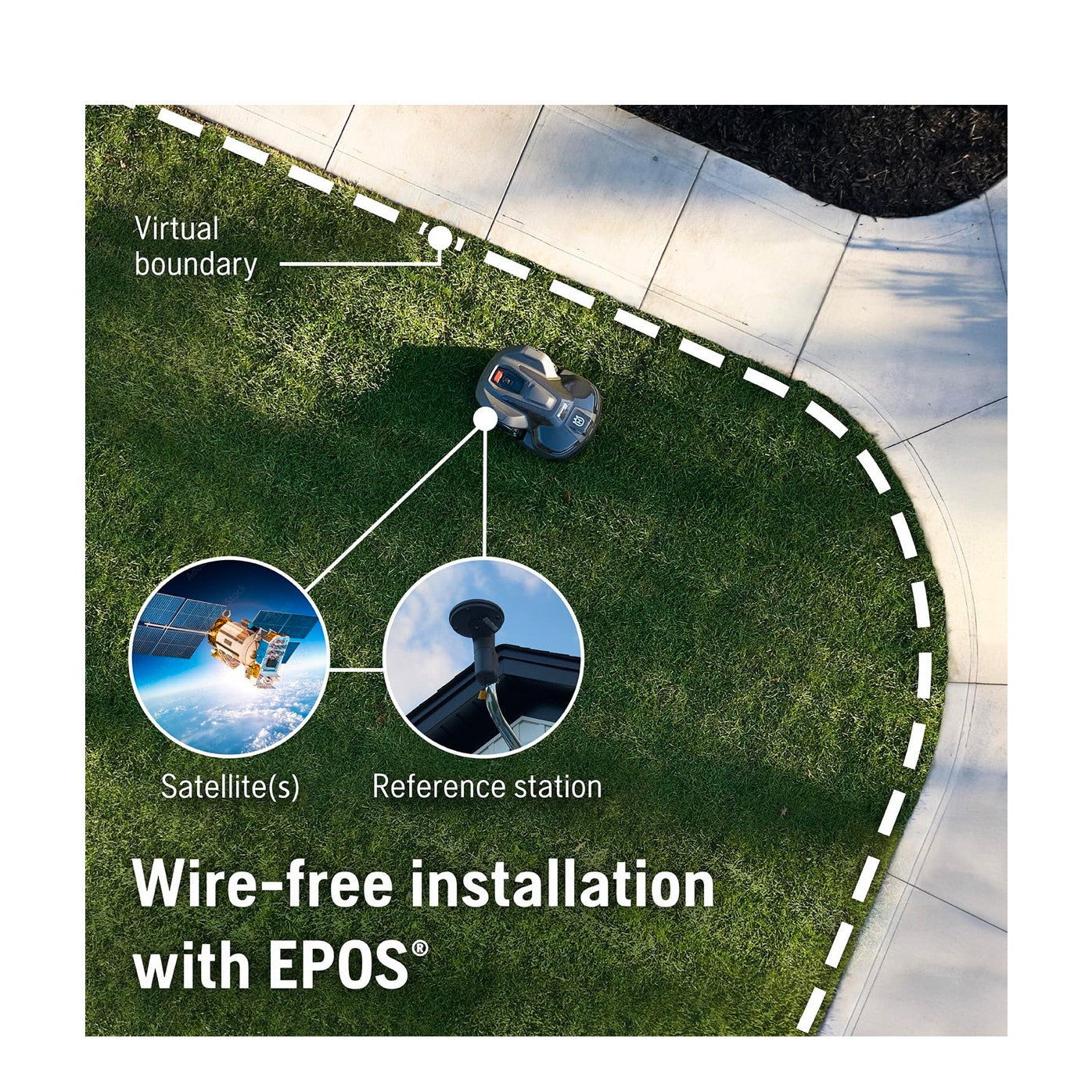 $ 2,100 OBO Husqvarna 410iQ Automower Robotic Mower, 0.5 Acre Mowing Capacity, Wire Free Robot Lawn Mower with Charging Station, RS1 EPOS Reference Station and Replacement Blades,