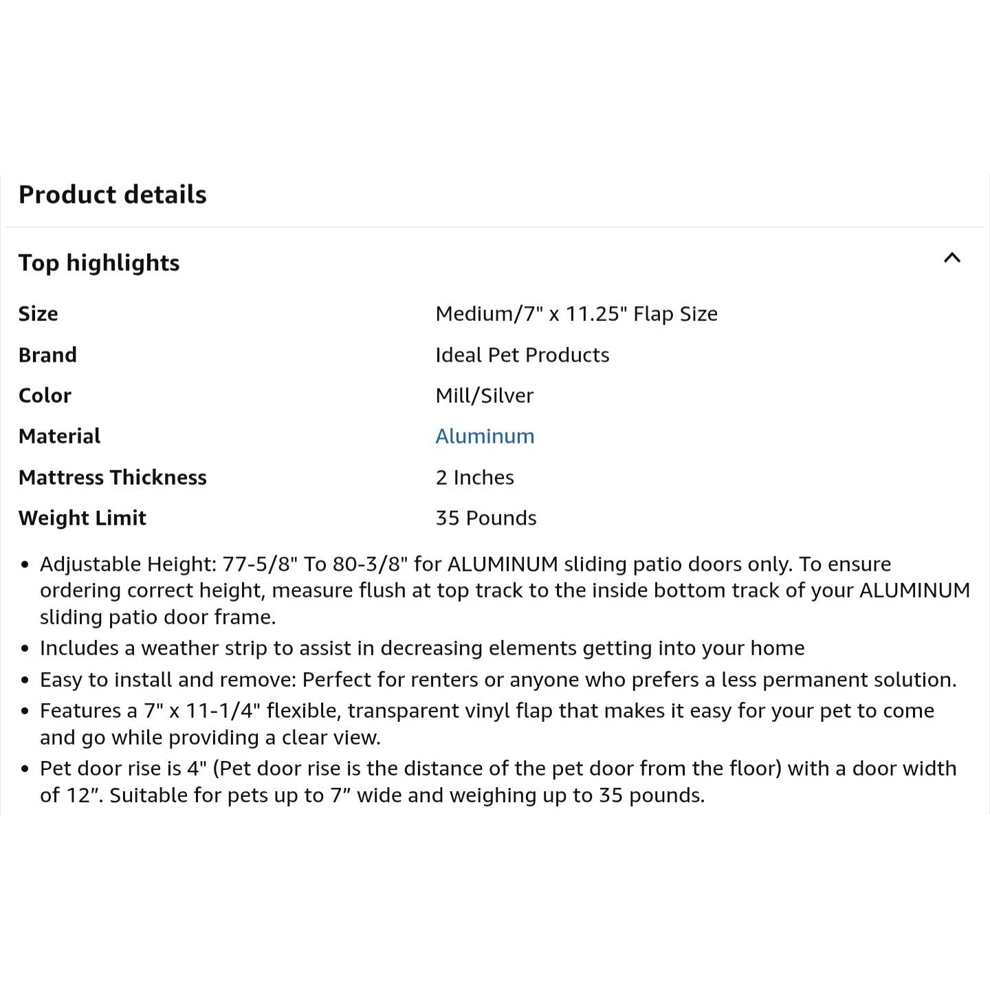 $ 115 obo Ideal Pet Products Aluminum Pet Patio Door, Adjustable Height 77-5/8" to 80-3/8", 7" x 11-1/4" Flap Size, Mill/Silver