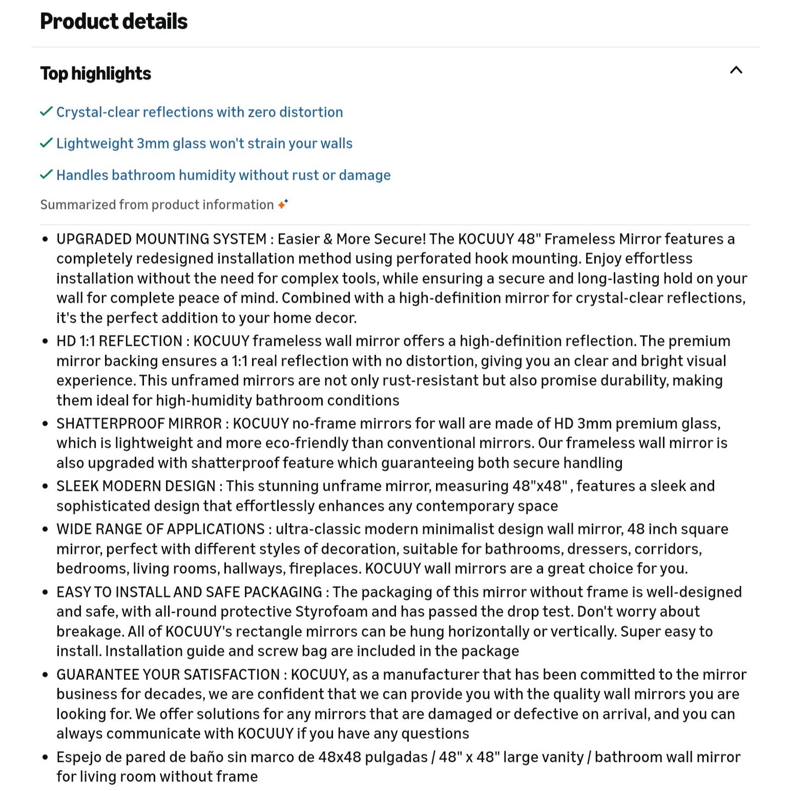 $ 150 obo KOCUUY Large Frameless Mirror, 48x48 Inch Square Bathroom Vanity Mirror for Over Sink, Upgraded Shatterproof Unframed Design for Bedroom, Living Room, Entryway
