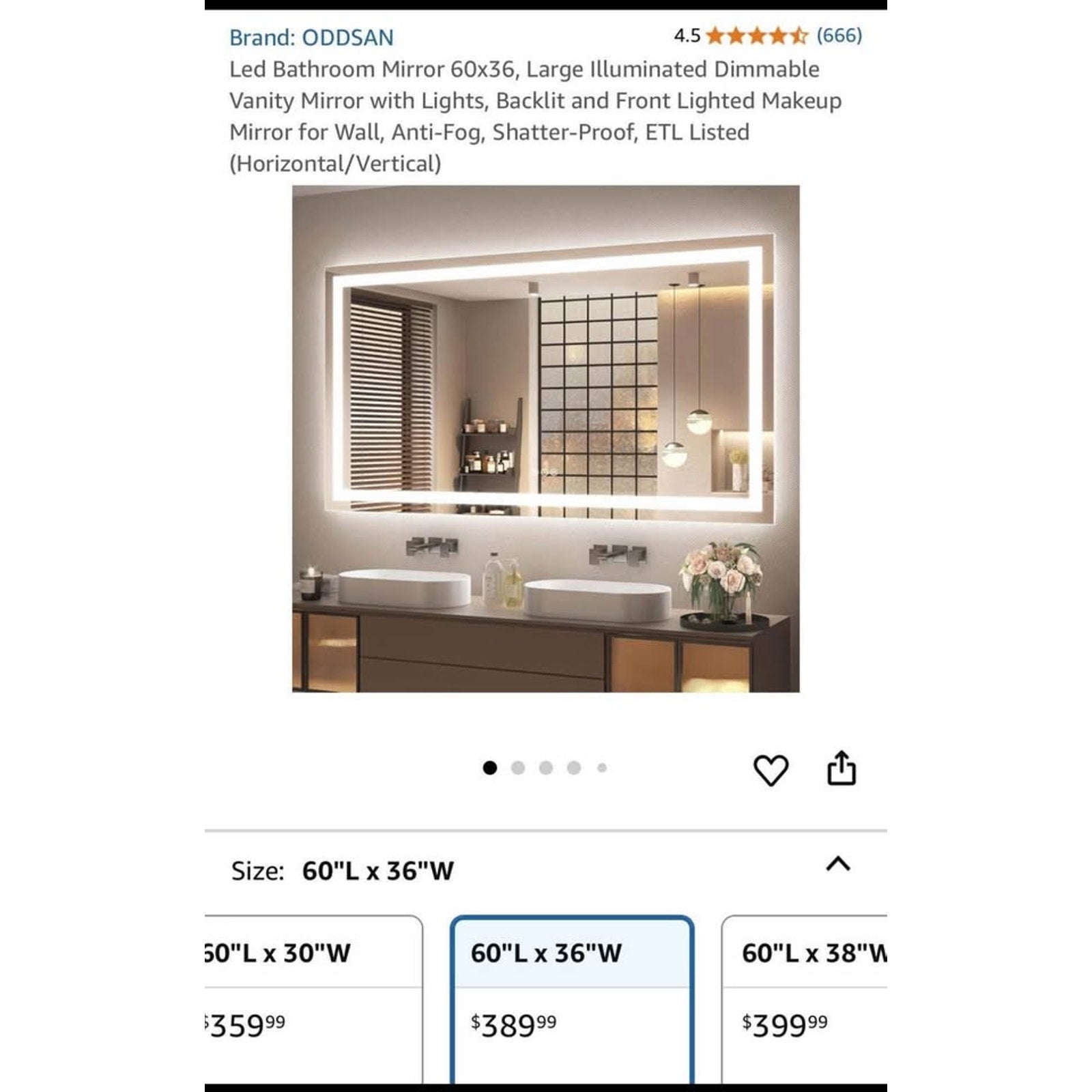 $210 obo Led Bathroom Mirror 60x36, Large Illuminated Dimmable Vanity Mirror with Lights, Backlit and Front Lighted Makeup Mirror for Wall, Anti-Fog, Shatter-Proof, ETL Listed (Horizontal/Vertical)