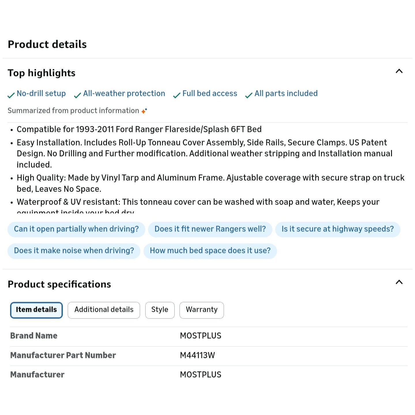 $ 140 obo MOSTPLUS Roll-Up Soft Vinyl Truck Bed Tonneau Cover Compatible for 1993-2011 Ford Ranger Flareside/Splash 6FT Feed Bed
