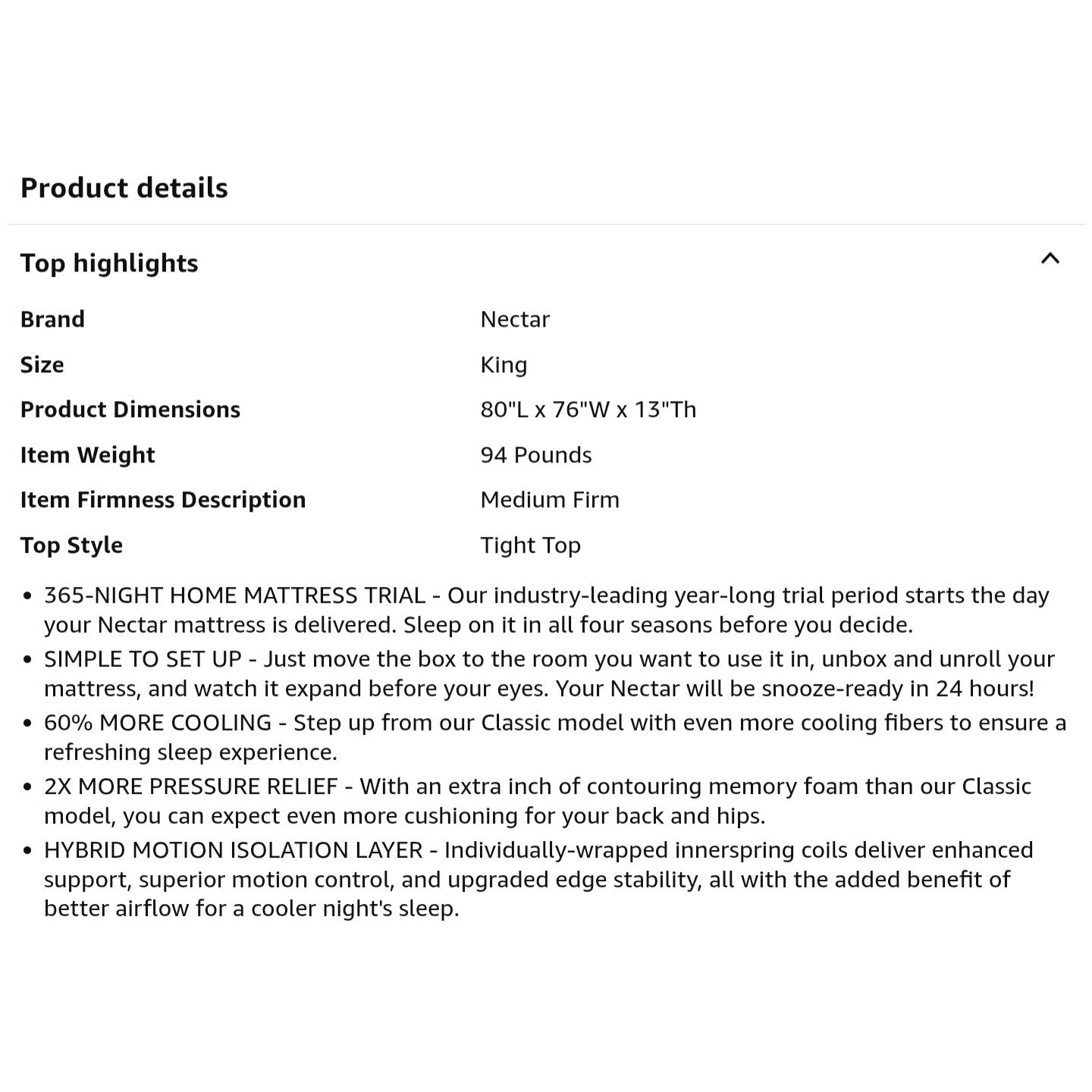 $ 920 obo Nectar Premier Hybrid 13” King Mattress - Medium Firm - Memory Foam & Innerspring Coils - Cooling Upgrade - 2” Pressure Relief Layer - Mattress in a Box - 365-Night Trial & Forever Warranty