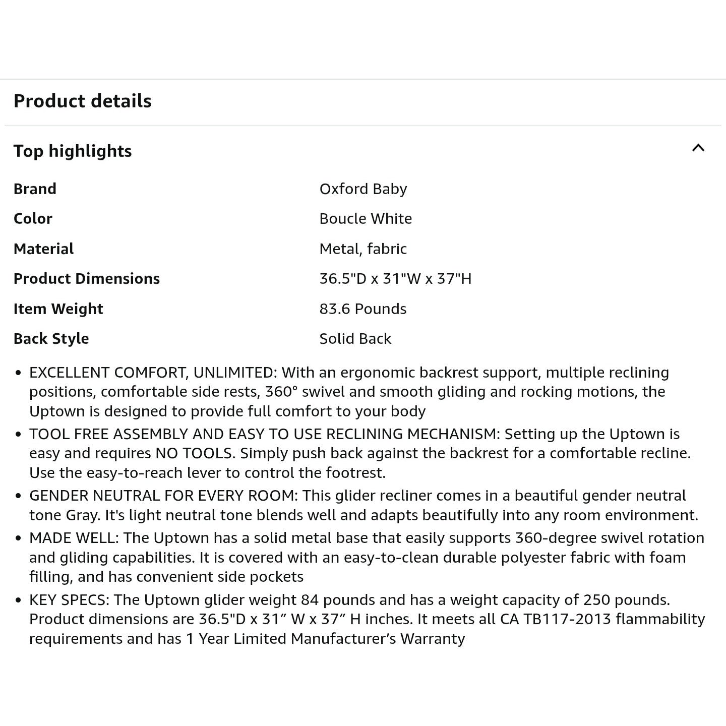 $ 260 obo Oxford Baby Uptown Upholstered Swivel Glider and Recliner Nursery Chair, Boucle White