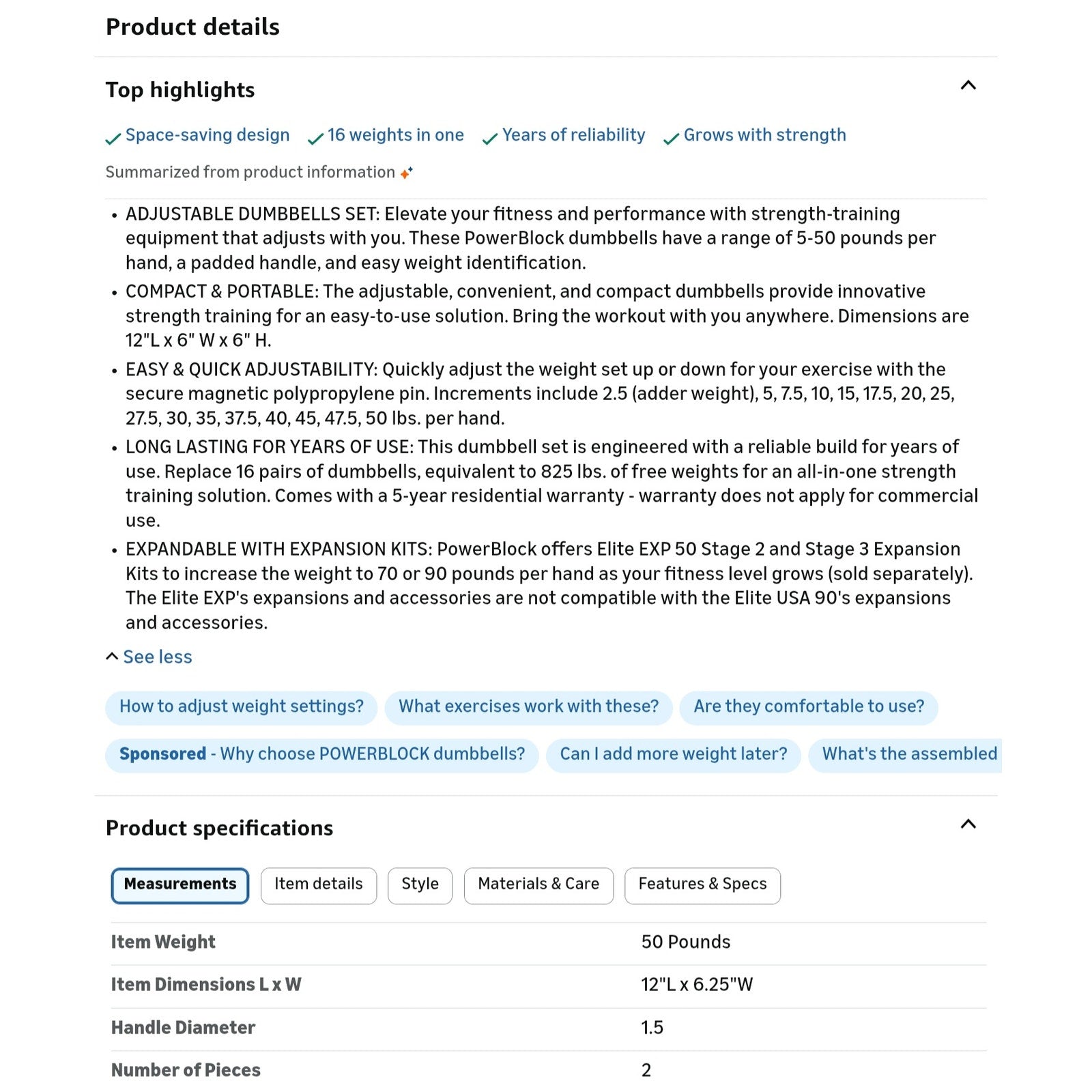 $ 315 OBO PowerBlock Elite EXP Adjustable Dumbbells, Sold in Pairs, Stage 1, 5-50 lb. Dumbbells, Durable Steel Build, Innovative Workout Equipment, All-in-One Dumbbells, Expandable with Expansion Kits