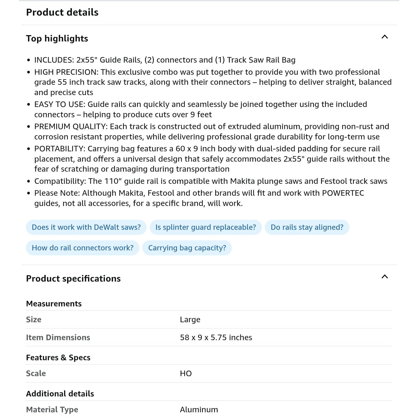 $ 90 OBO POWERTEC 71550 55" Track Saw Guide Rail Kit for Makita or Festool | Includes (2) Guide Rails/Protective Guide Rail Bag/Rail Connectors