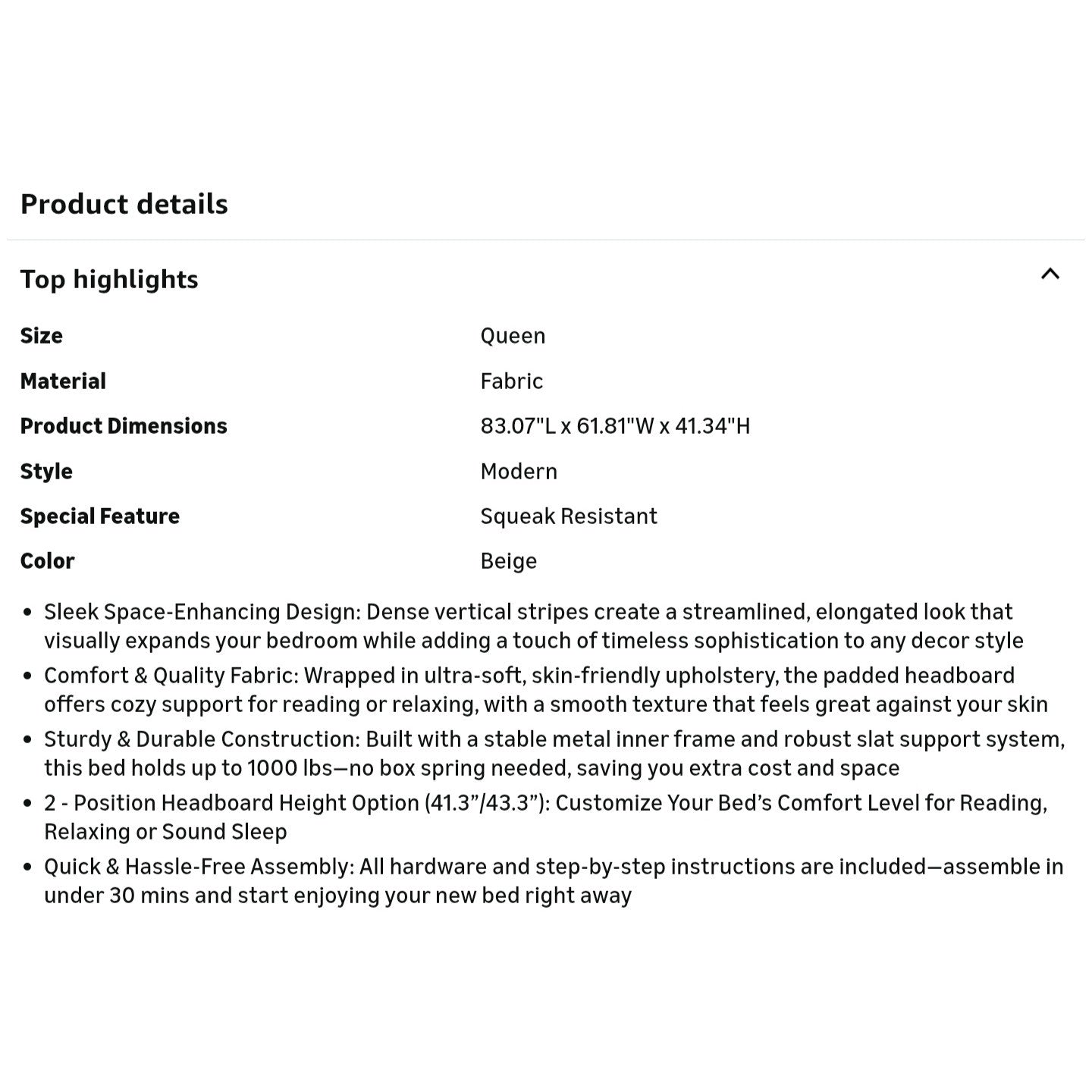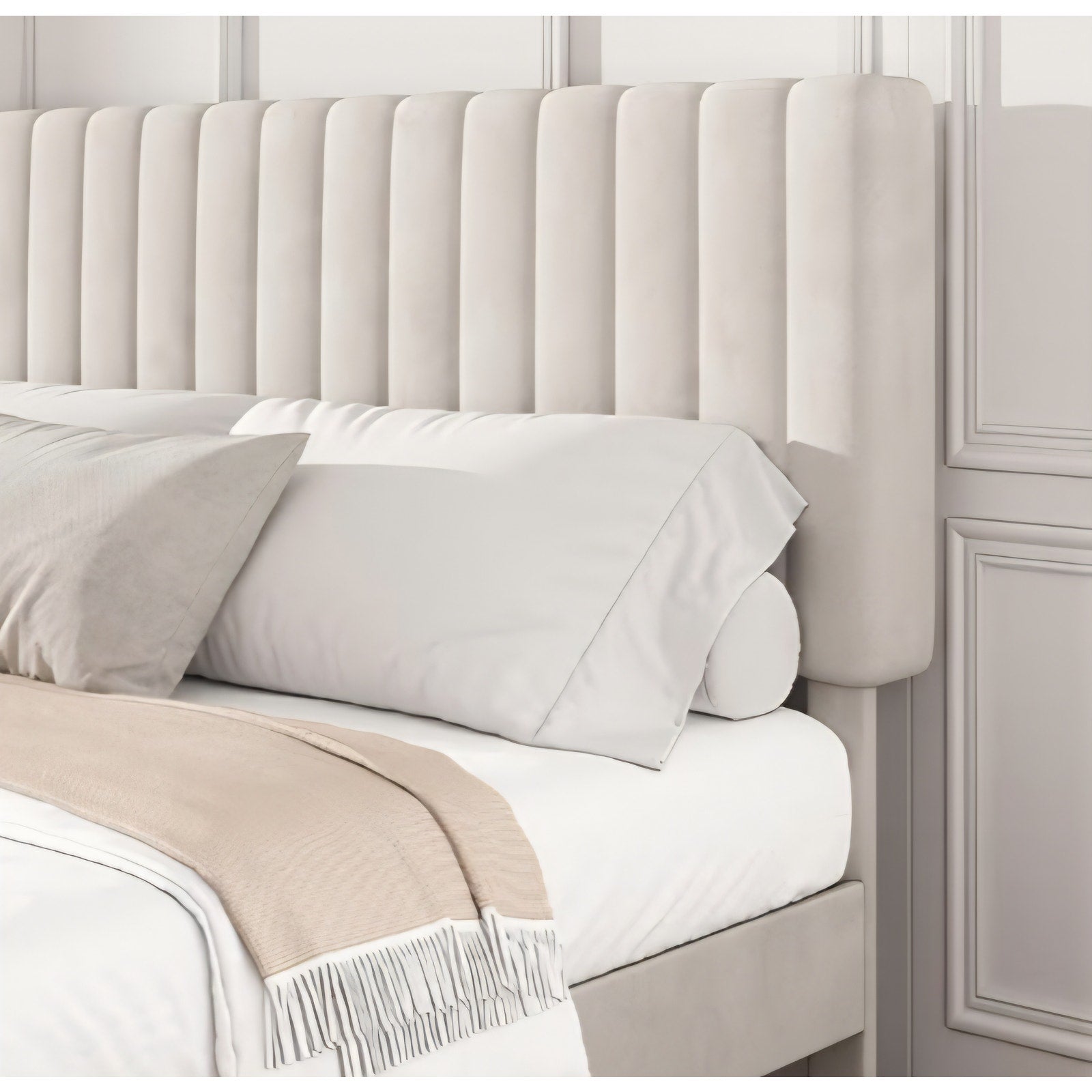 $ 120 Queen Size Platform Bed Frame with Vertical Channel Tufted Headboard, No Box Spring Needed, Noise-Free, Easy Assembly, Beige Velvet