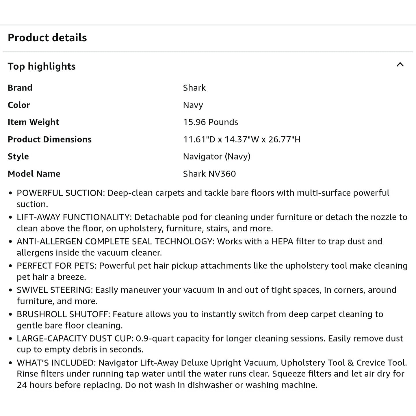 $ 155 obo Shark Upright Vacuum, Navigator Lift-Away Deluxe with Large Dust Cup Capacity, HEPA Filter, Swivel Steering, Upholstery Tool & Crevice Tool, Blue, NV360