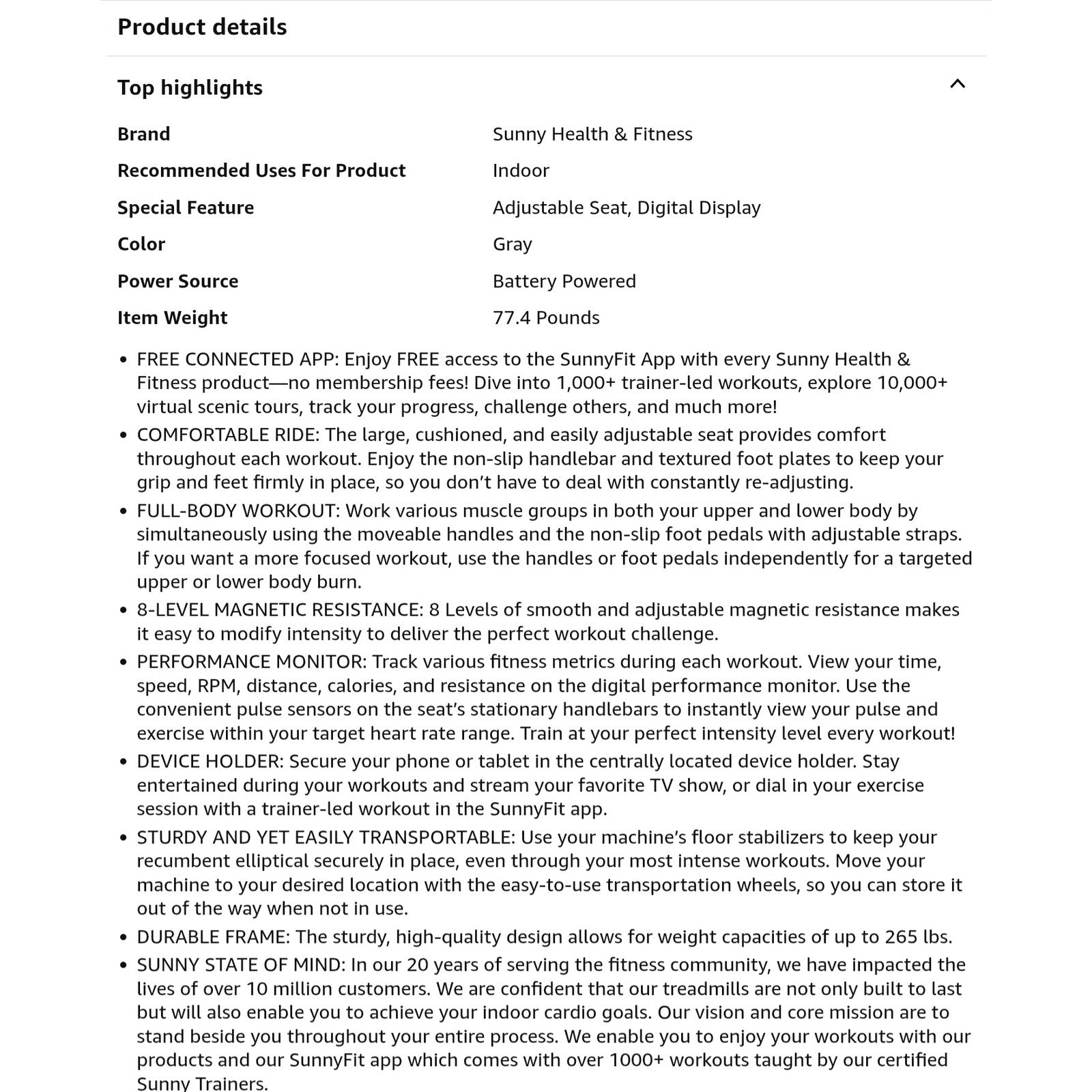 Sunny Health & Fitness Smart Recumbent Bike, Full-Body Home Training with Arm/Leg Exercisers,