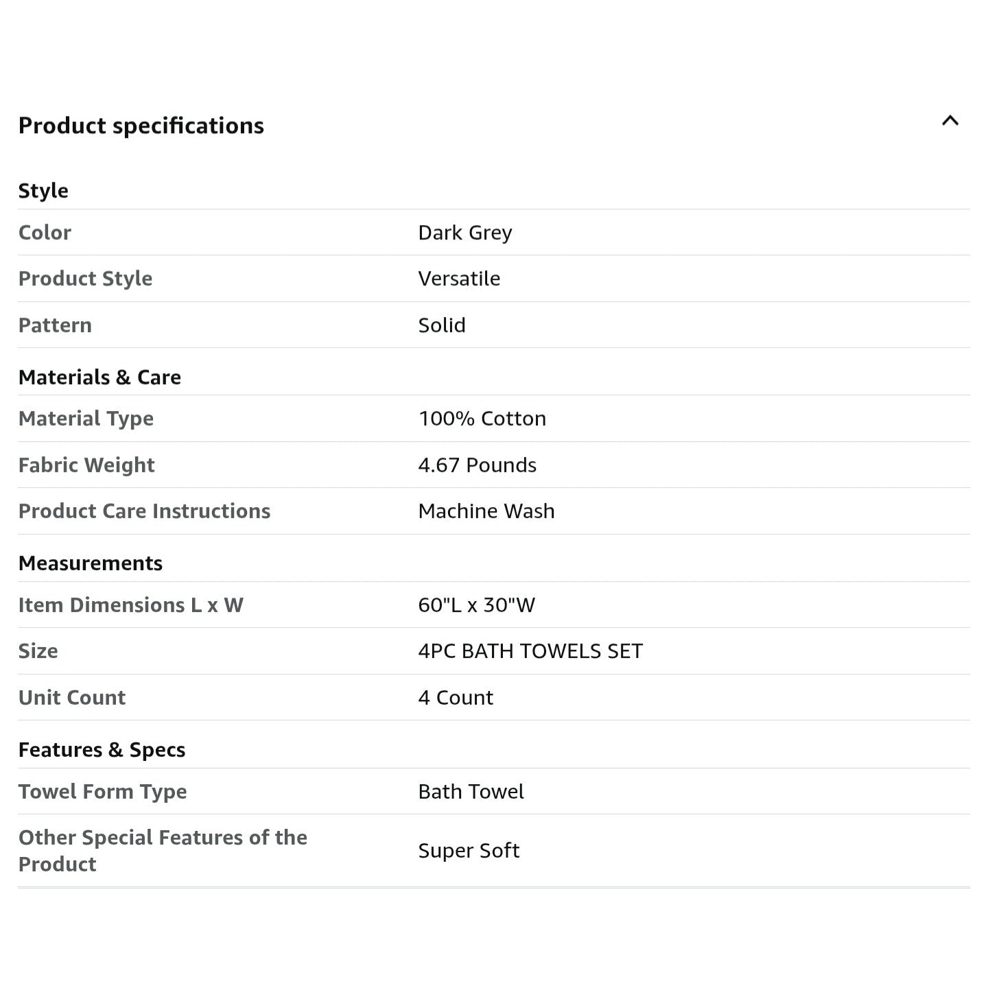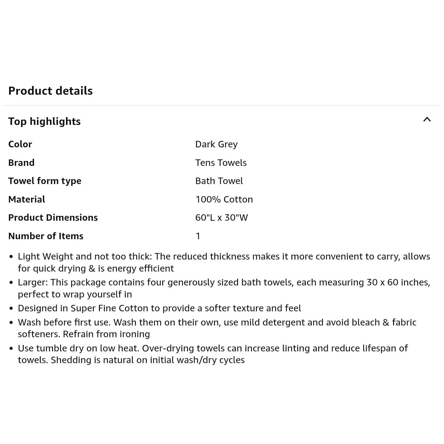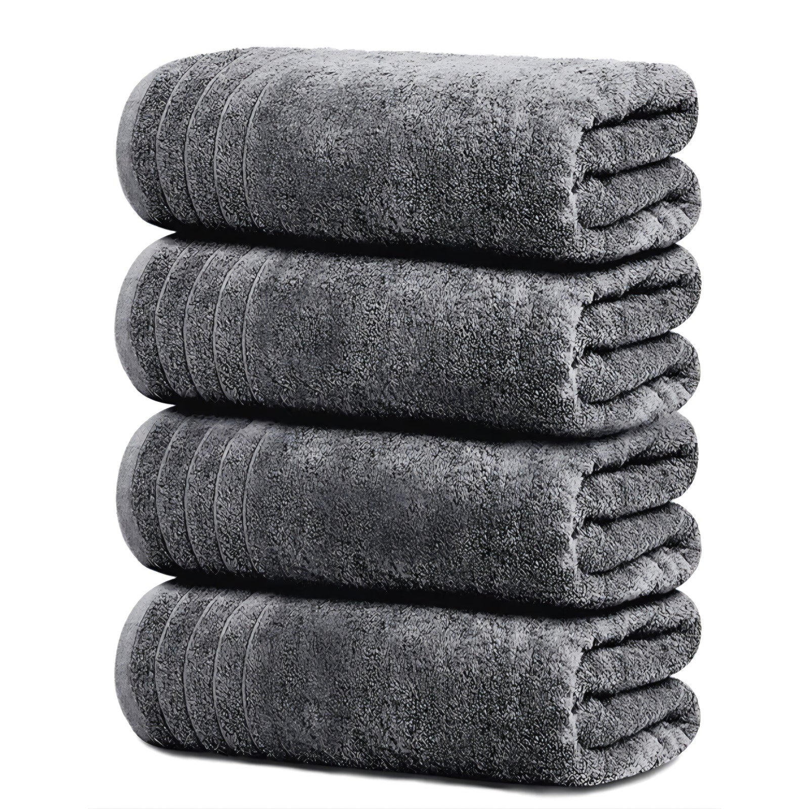 $ 25 Tens Towels Pack of 4 Extra Large Bath Towels 30 x 60 Inches, 100% Cotton, Larger & Lighter Weight, Quicker to Dry, Super Soft and Absorbent, Perfect for Bathroom, Dark Grey