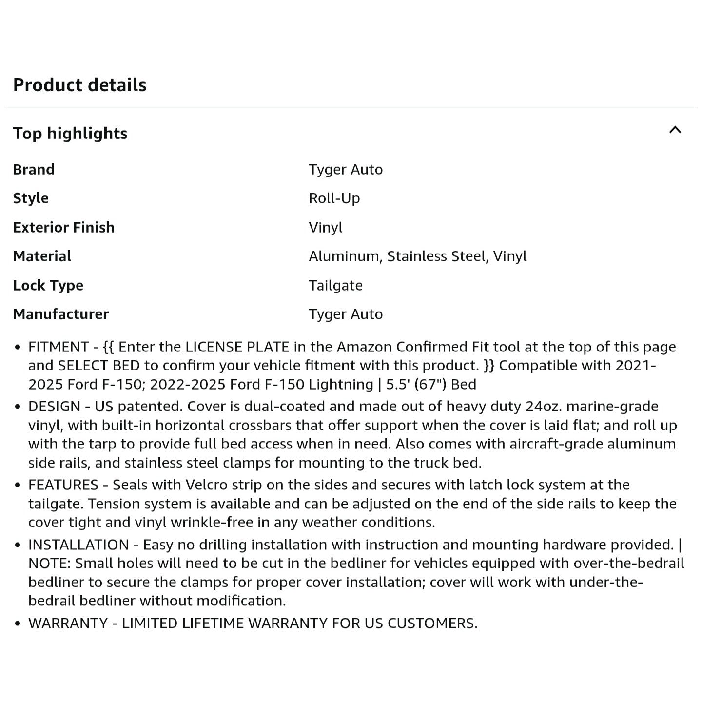 $ 145 obo Tyger Auto T1 Soft Roll-up Truck Bed Tonneau Cover Compatible with 2021-2025 Ford F-150; Lightning | 5.5' (67") Bed | TG-BC1F9064