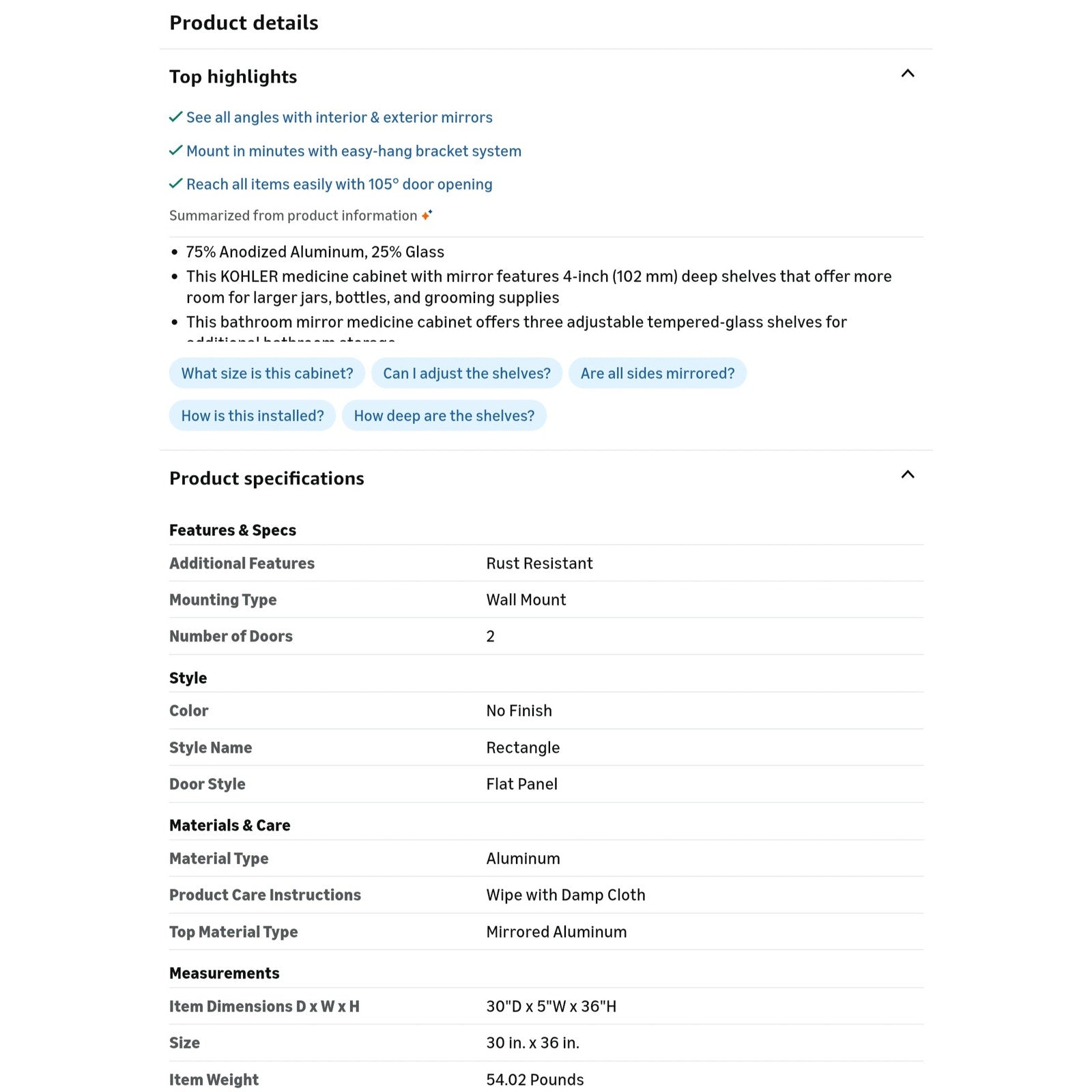 $ 285 obo Kohler 56553-NA Embark Premium XL Mirrored Medicine Cabinets for Bathroom, Deep Rectangular Storage with Adjustable Shelves and Mirrored Doors, 30 in. W x 36 in. H