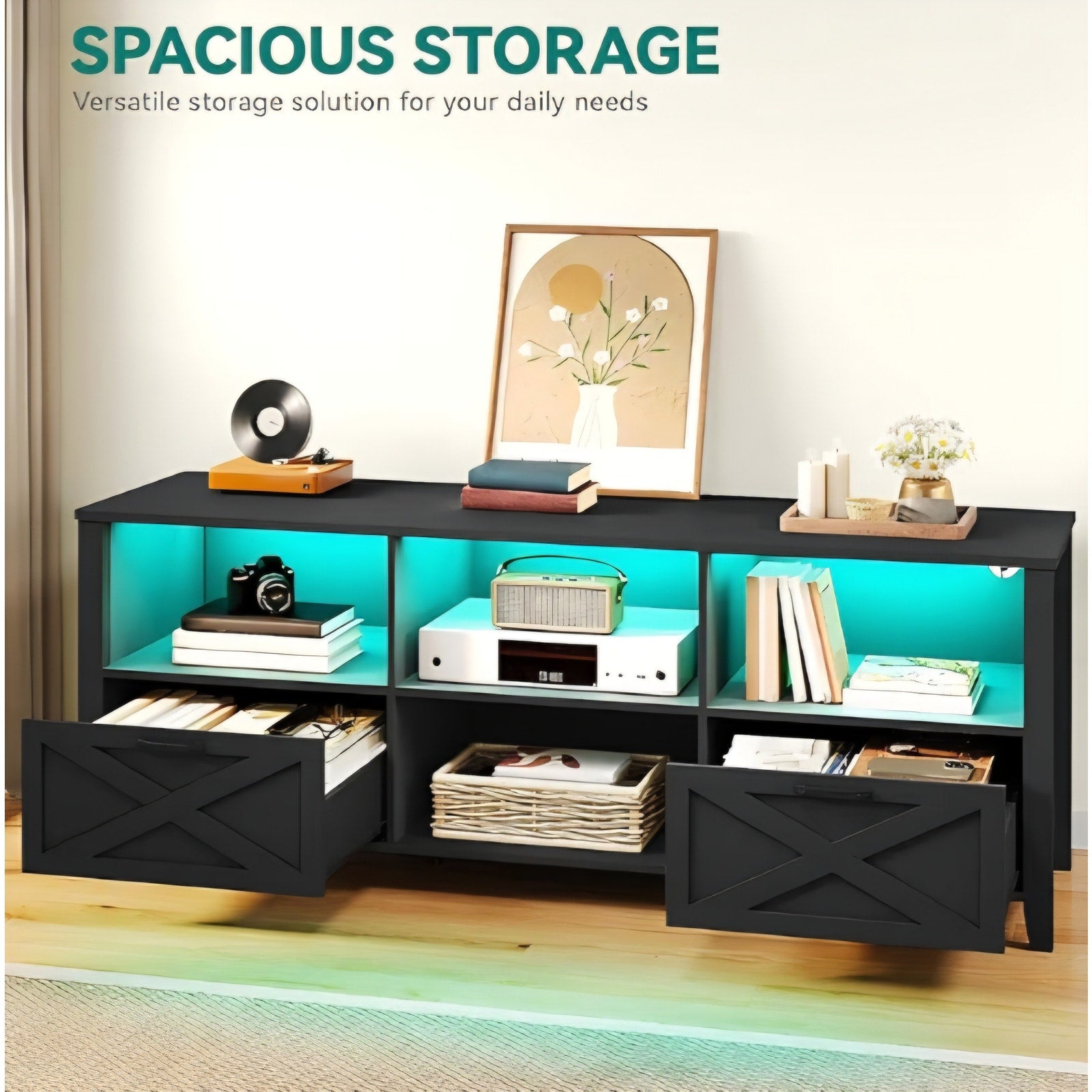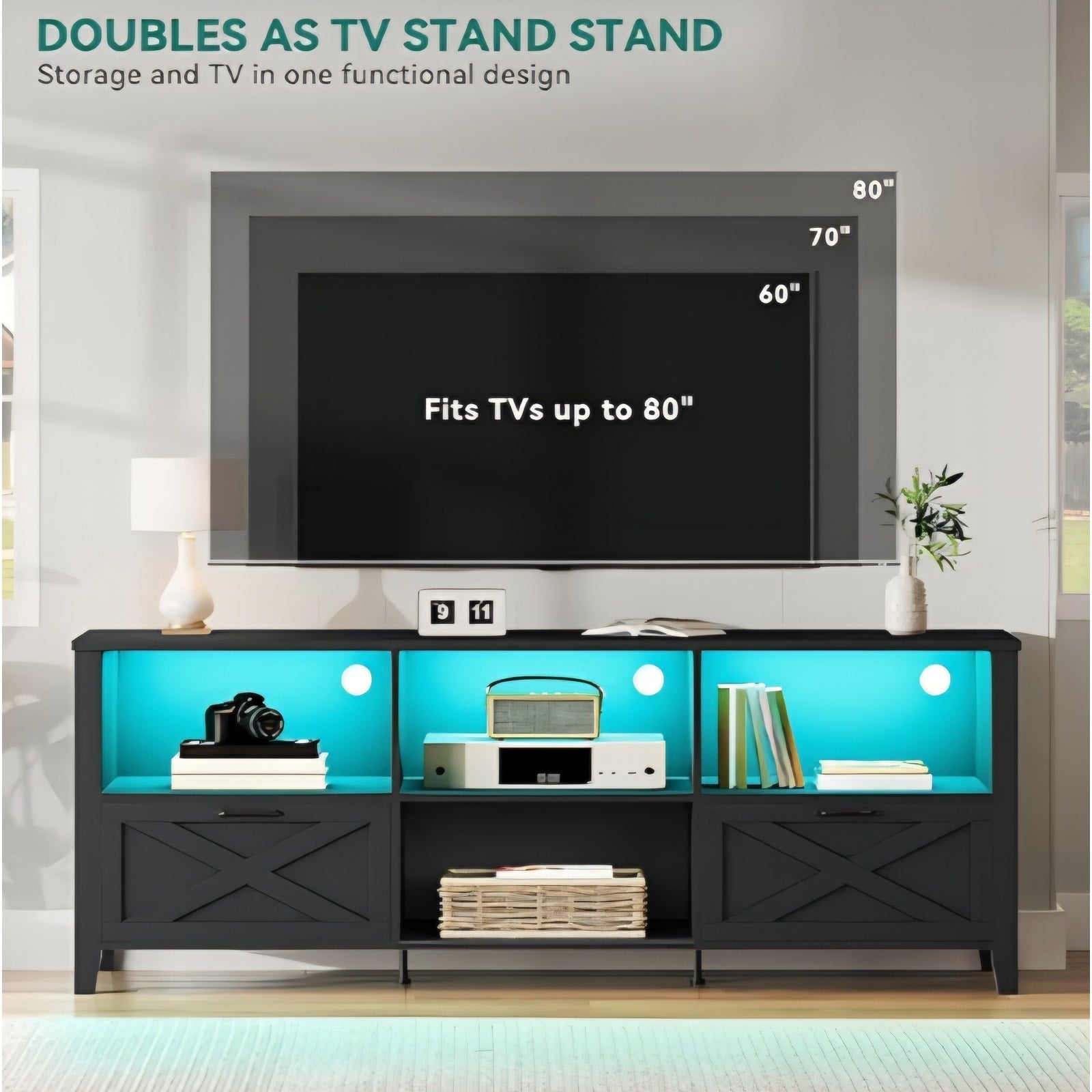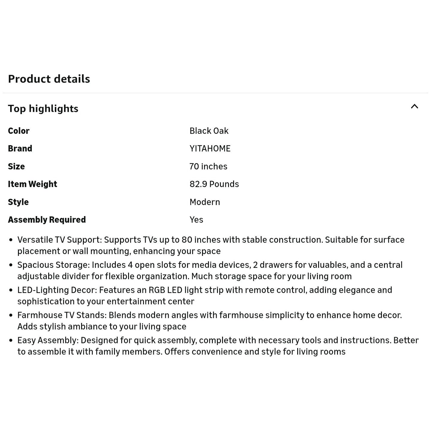 $ 115 YITAHOME 70 Inch Farmhouse TV Stand with LED Lighting, Fits TVs up to 80 Inches, Media Console with Storage and Customizable Divider, Entertainment Center for Living Room (Black)