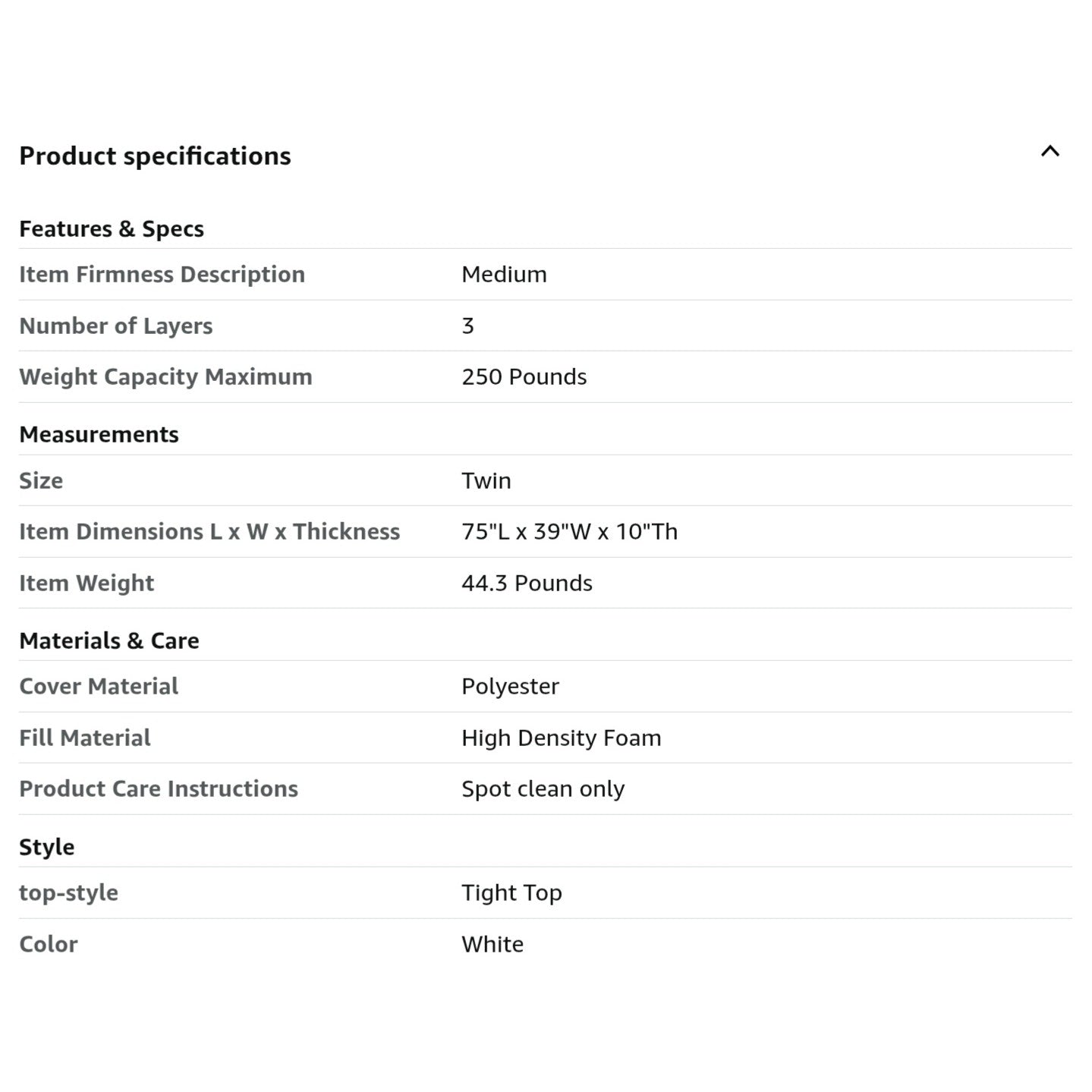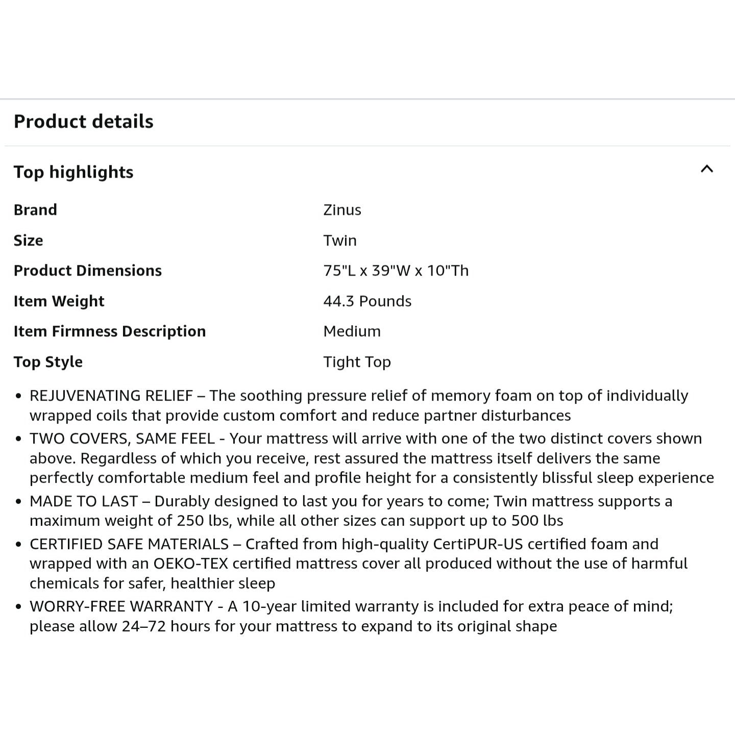 $ 150 OBO ZINUS 10 Inch Comfort Support Hybrid Mattress [New Version], Twin, Fiberglass Free, Medium Plush, Motion Isolation, Certified Safe Foams & Fabric, Mattress in A Box