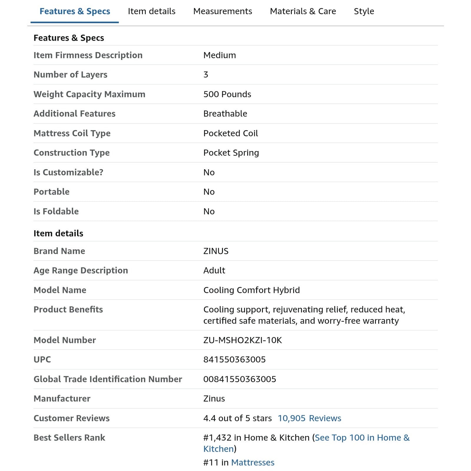 $ 185 obo ZINUS 10 Inch King Cooling Comfort Hybrid Mattress [New Version], Fiberglass Free, Medium Firm Feel, Motion Isolation, Certified Safe Foams & Fabric