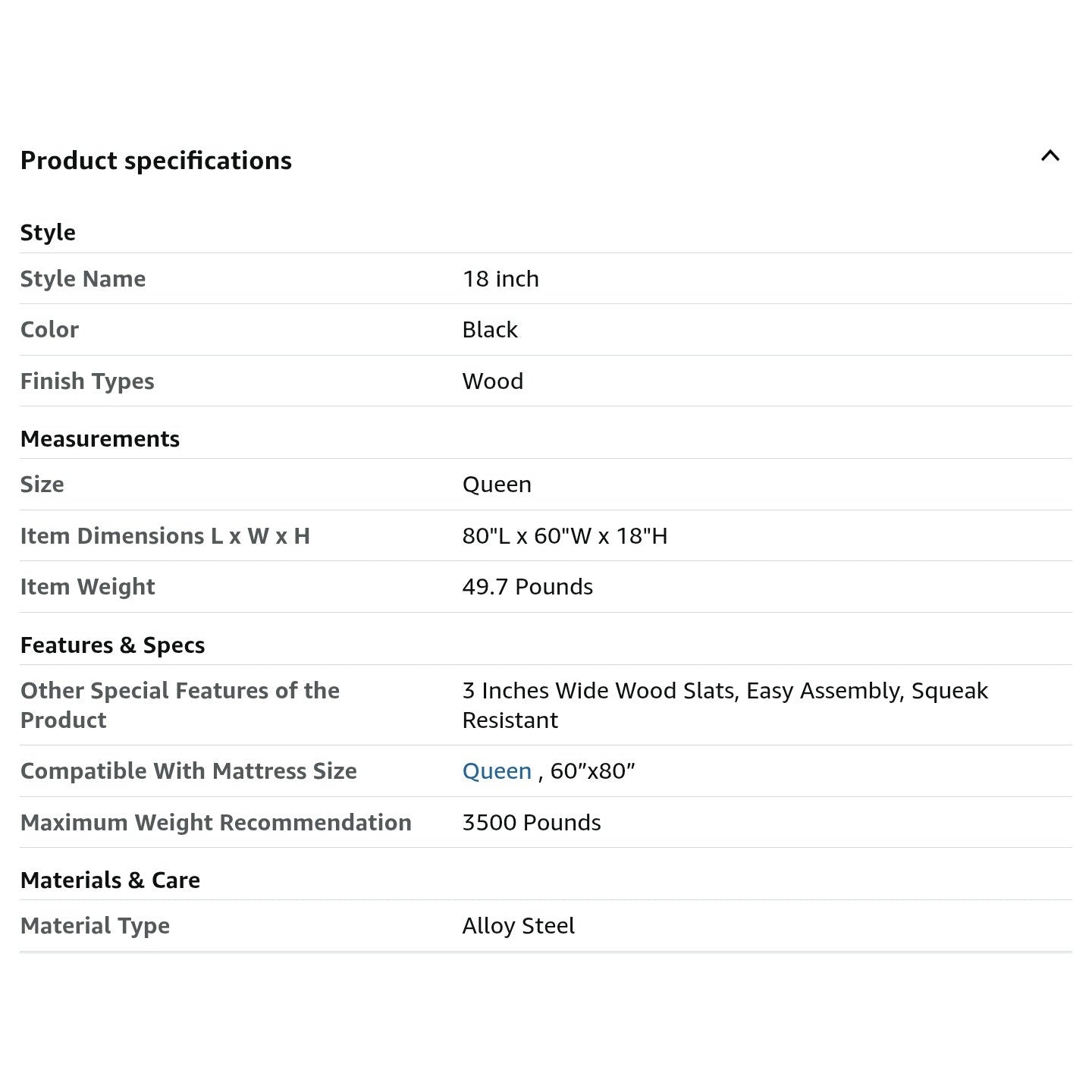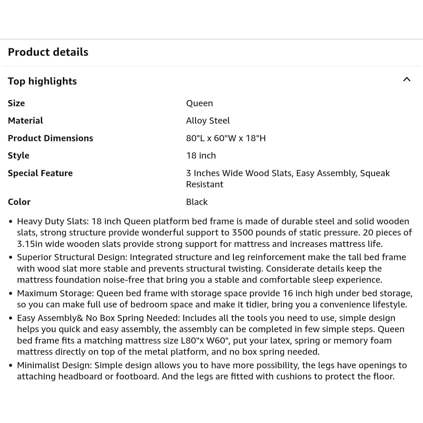 $ 120 obo ZIYOO Queen Size Bed Frame 18 Inches Tall, 3 Inches Wide Wood Slats with 3500 Pounds Support for Foam Mattress, No Box Spring Needed, Heavy Duty Metal Platform, Easy Assembly, Noise Free