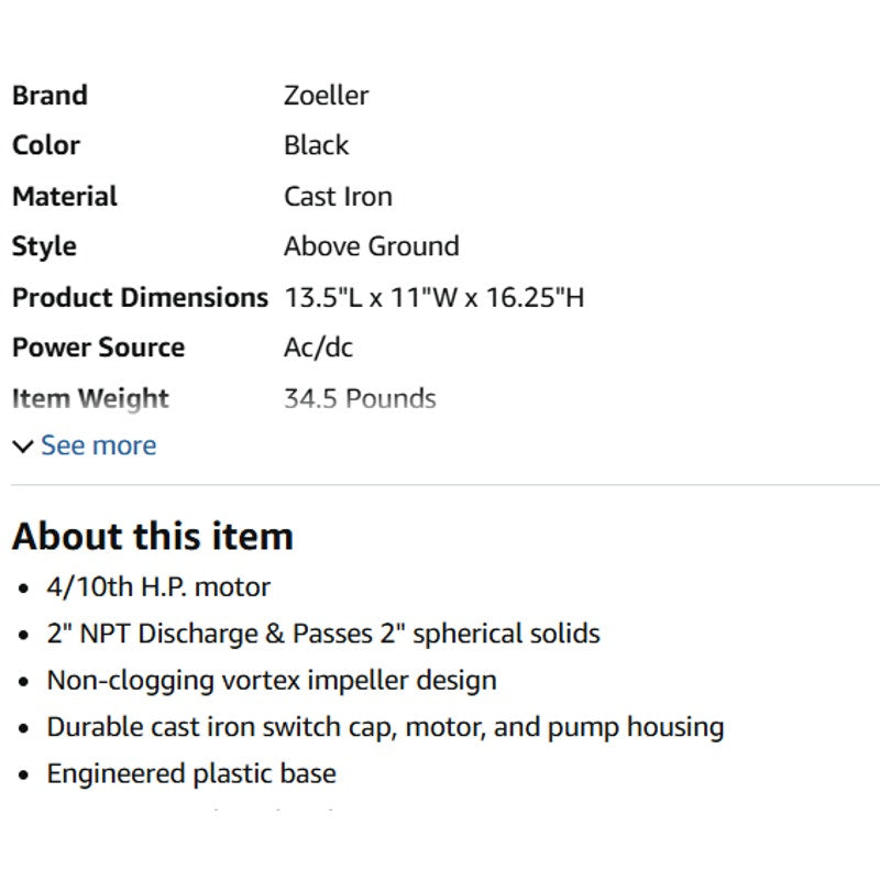 $270 Zoeller M264 Waste-Mate Sewage Pump, 4/10th Horsepower, 115V
